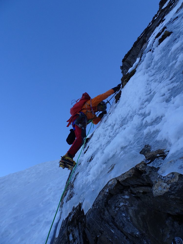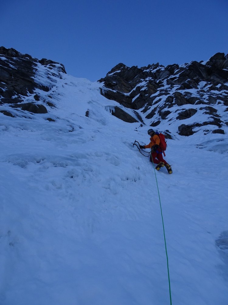 4. SL Die Steilplatte von links 2 BH diagonal nach rechts in heikler Kletterei und ins Eis. Nach 25 m heikler Übergang in flaches Gelände und fast waagrecht weitere 20m zu einem kleinen Fels mit BH Stand in der Rinne. M5, WI 4+