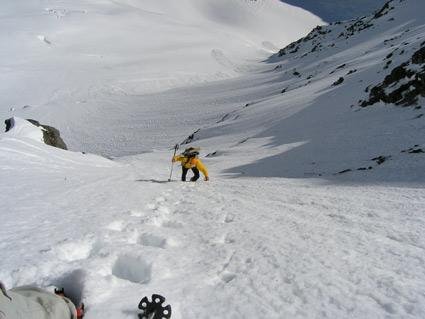 Unten das Firnfeld links vom Pfeiler aufwärts, dann steigt man leicht rechts aufwärts um oben auf einen vermeintlichen Grat zu gelangen - auf diesem gerade aufwärts und rechts an einer großen blockartigen Felswand vorbei zur Ausstiegswechte und über diese ins flache Gelände.
