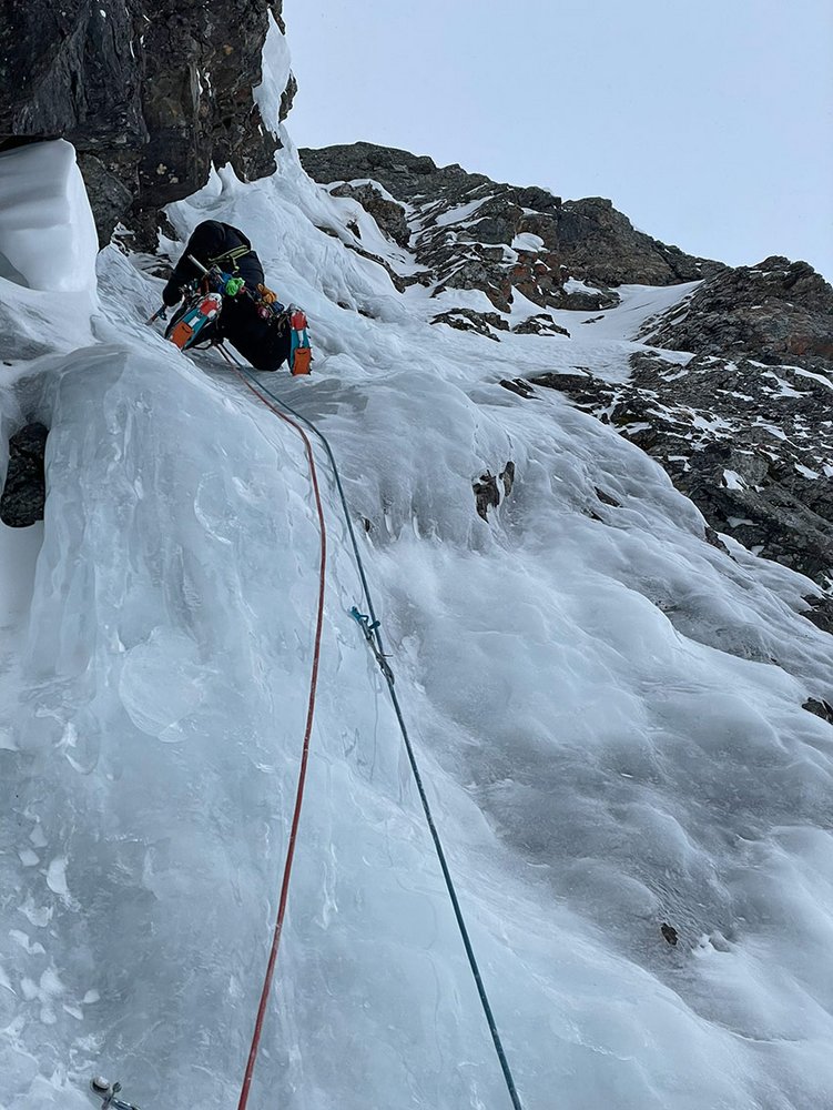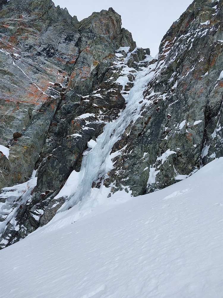 Abstieg: abseilen über die Route oder weiter über großes Couloir bis zum Gipfel.