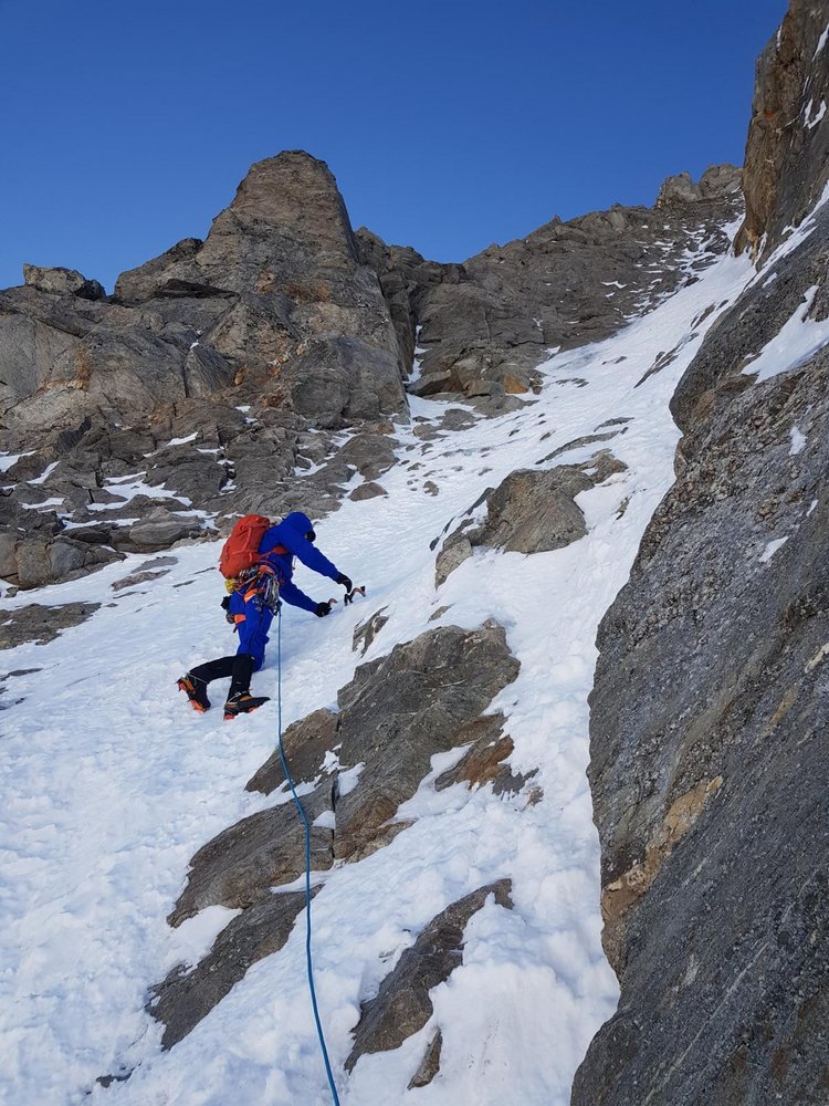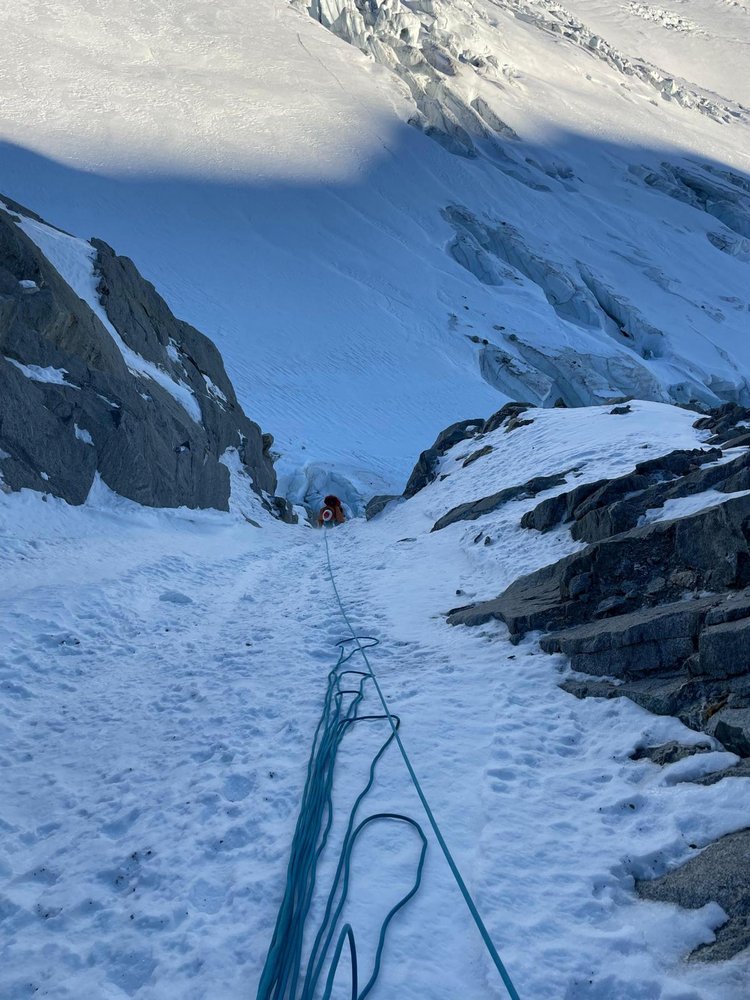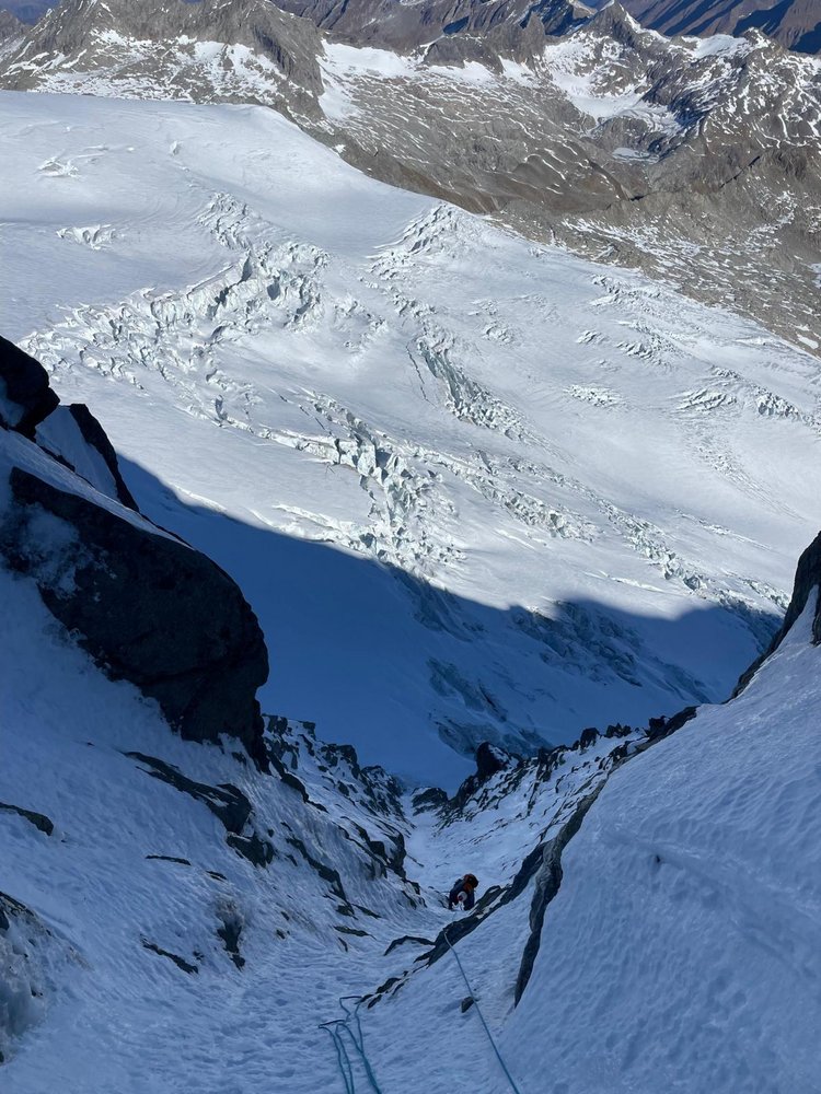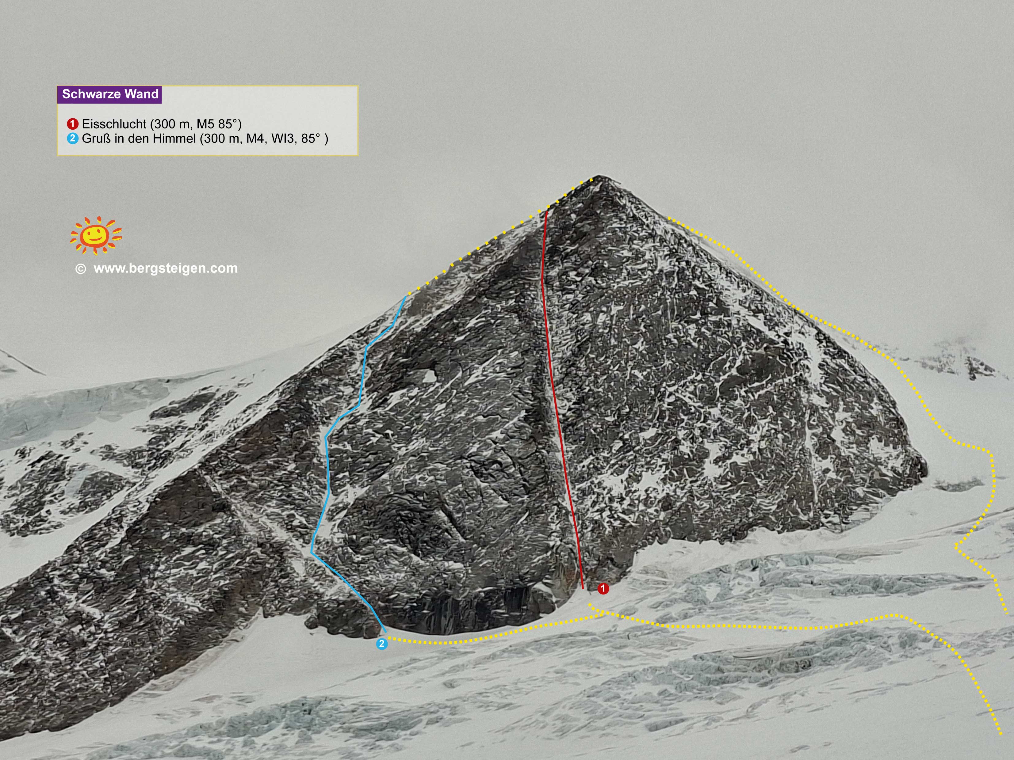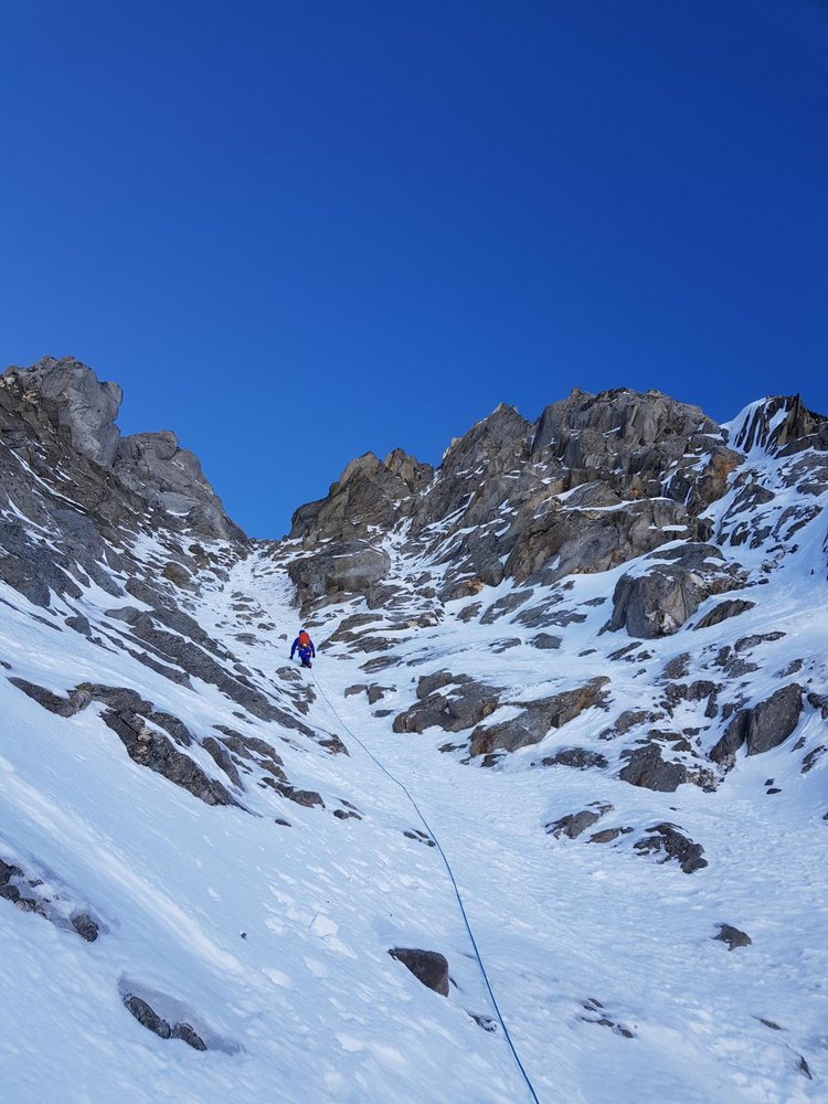 Wunderschönes Gully, das seit Abtauen des Eises nur im Herbst und Frühjahr bei guter Schneelage/Vereisung kletterbar sein dürfte und dann alpine Erfahrung und Eigeninitiative verlangt.