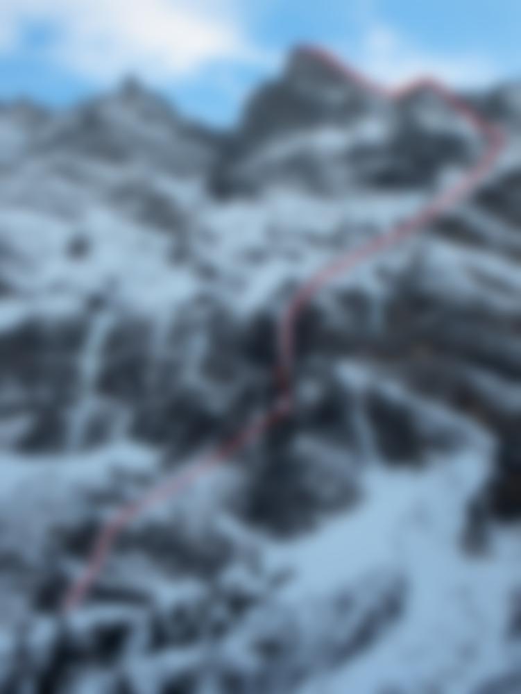 Die Route stellte sich als Kombination aus Nordwand Route mit steilen Schnee und Mixedpassagen (M5) und längeren, senkrechten Eiszapfen bis WI 6 heraus. Vor allem die steile, spinnenartige Eislänge am Ende des ersten Drittels biete Eiskletterei vom Feinsten und in Kombination mit den Teilen danach und davor eine schöne lange alpine Linie!