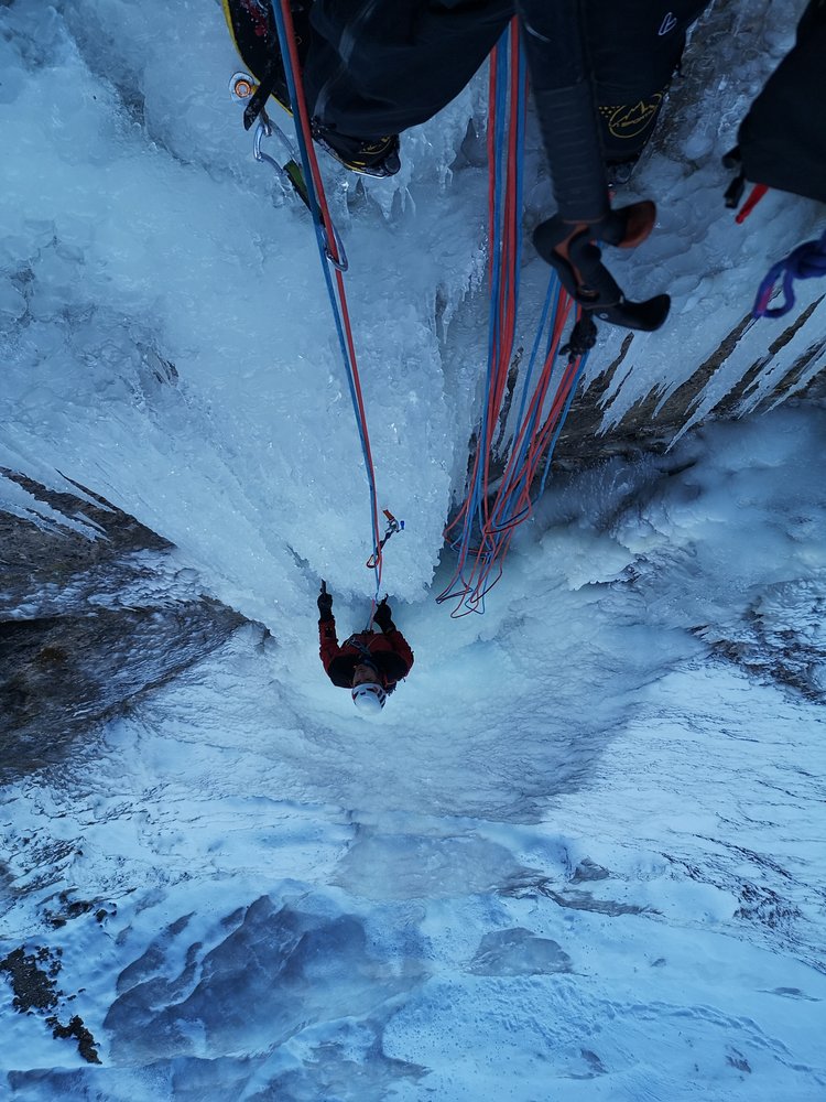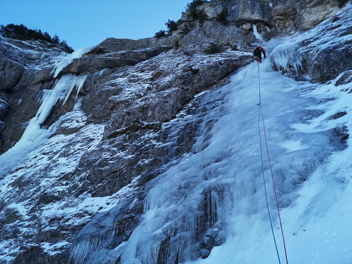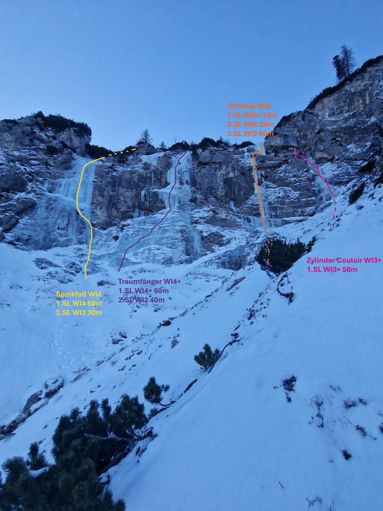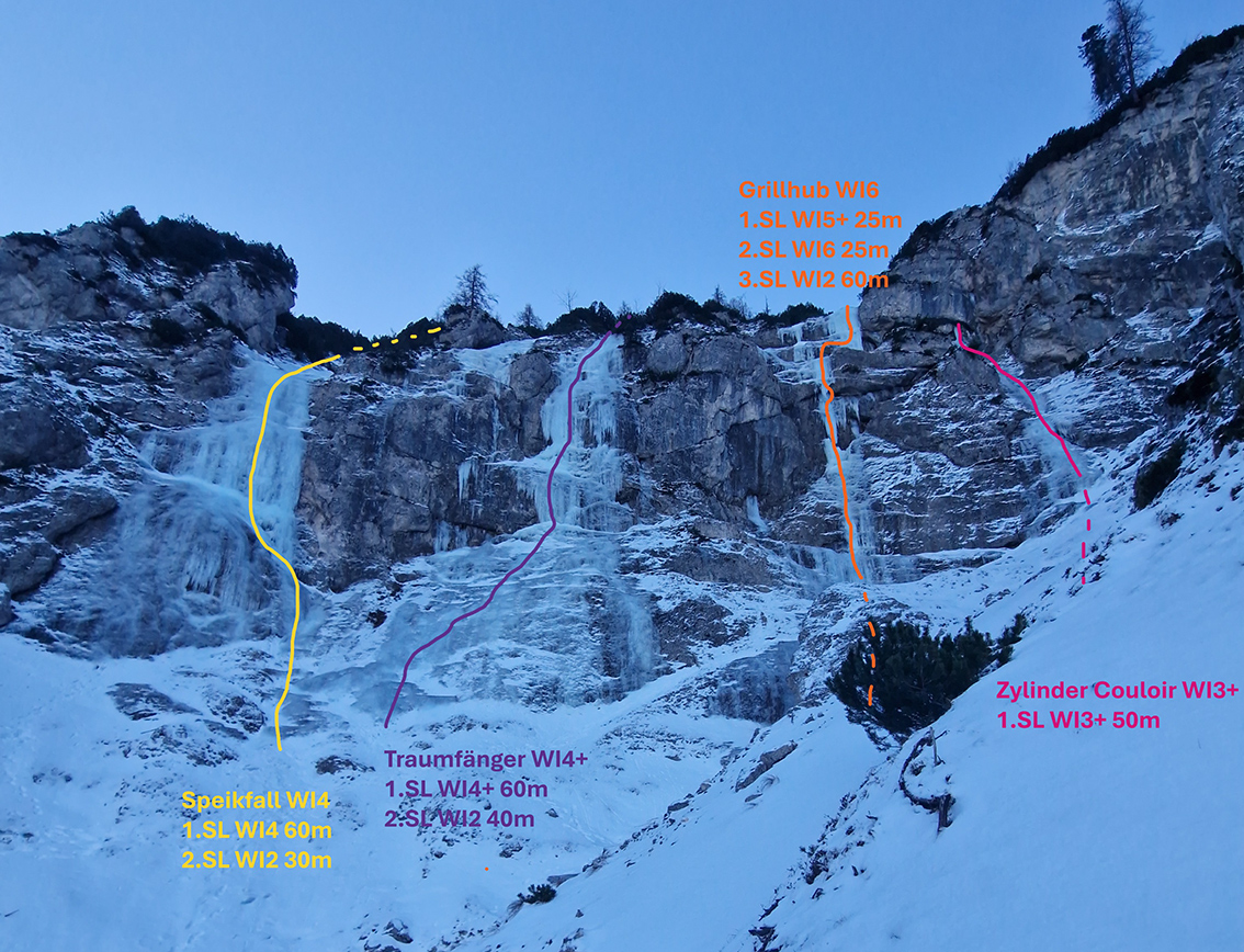 Grillhub: 1.SL WI5+ 25 m (Stand unter dem Eisvorhang) / 2.SL WI6 25 m (Eisvorhang und Steilstufe) / 3.SL WI2 60 m