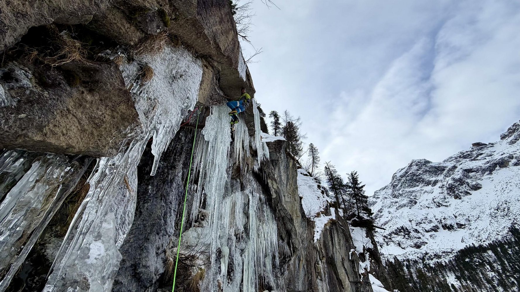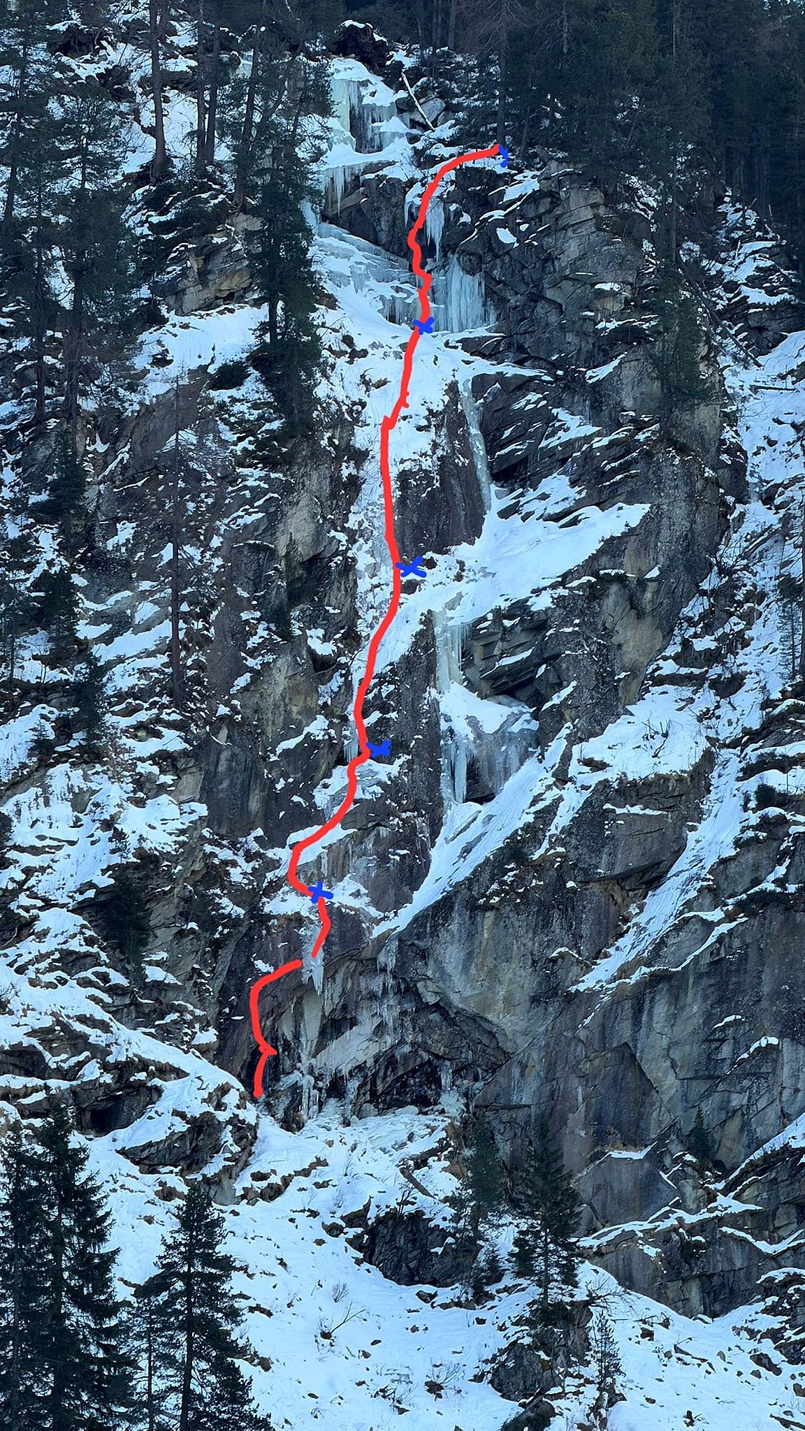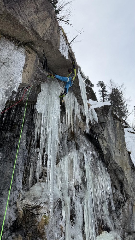 Tolle und anspruchsvolle Mixed Linie, die auch bei wenig Eis, wie zuletzt, siehe Wandfoto, immer kletterbar sein dürfte. Wenngleich die 1. SL in trockenem Zustand (unter dem Dach) dann noch schwieriger wird. Am 7. 12.2025 hatten wir gutes Eis (siehe Foto), am 22.1.26 nur mehr sehr wenig. Das Dach in der 1. SL frei zu klettern ist möglich aber sicher jenseits M8.