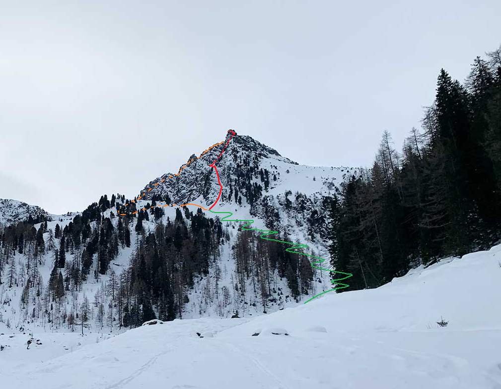 Der Einstieg befindet sich am Fuß der markanten Rampe, welche schon von Weitem sichtbar ist. Dieser Rampe folgt man bis zu deren Ende (bis zu 55°). Anschließend folgt eine kurze Querung in den oberen Teil der Route. Ab hier beginnt der recht logische Anstieg entlang der schönen Rinne bis zu einem kurzen Aufschwung (II+ / III-). Danach steigt man in immer steiler werdendem Gelände bis zum Ausstieg. Der Gipfel wird in kurzer Zeit über leichtes Gehgelände erreicht.