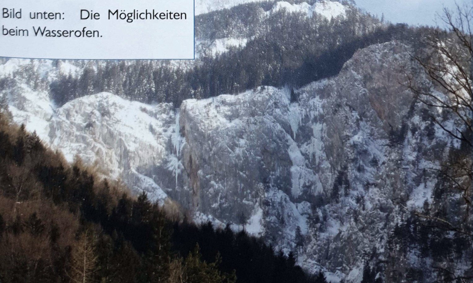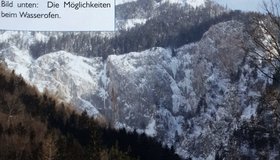 Die imposanten Eisgebilde im Wasserofen bei Kaiserbrunn wurden bis dato noch nicht bestiegen und sind aufgrund ihrer südseitigen Lage stark einsturzgefährdet - irgendwann passen die Verhältnisse aber. Man sieht die Fälle von Kaiserbrunn aus.