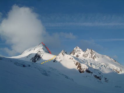 Rechts vom markanten Felsriegel in Gipfelfalllinie befindet sich ein großes Eisfeld das man nach Überwindung der Randspalte leicht rechtsquerend aufsteigt. An einer markante Felsecke gibt es zwei Möglichkeiten des Weiterweges. Durch eine kleine Rinne bis zum Nordgrat aufsteigen und diesen weiter zum Gipfel, oder leicht rechts weiter bis man kurz vor dem Gipfel auf den Westgrat trifft. Beide Linien sind ungefähr gleich schwierig, wobei die rechte Variante objektiv etwas sicherer sein dürfte.