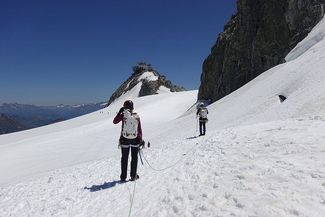 Vom Ende des Grates zuerst links und dann je nach Möglichkeit über den Gletscher zurück zur Torinohütte.