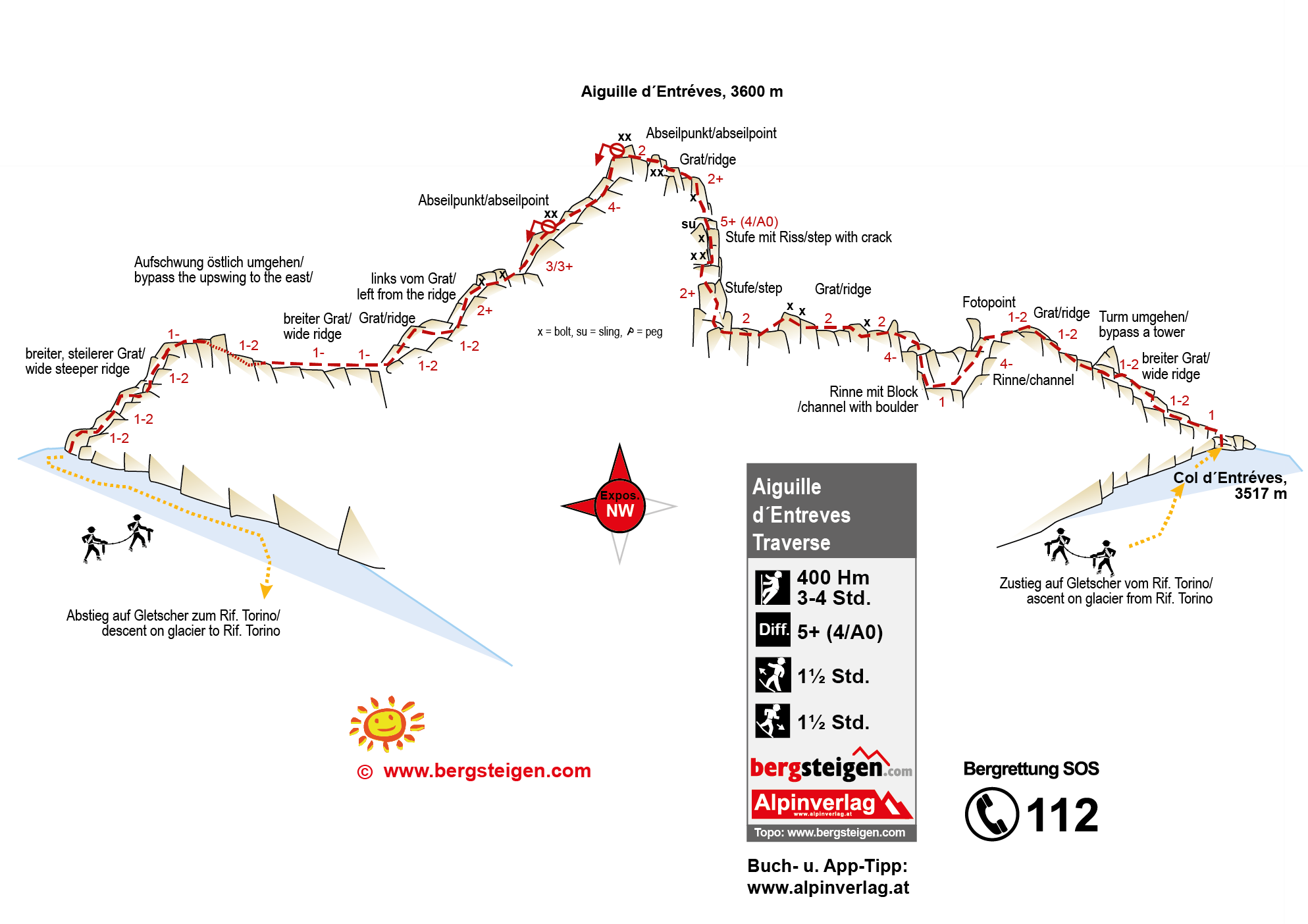 Vom Rifugio Torino auf dem Gletscher nördlich von Grand Flambeau und Aiguille de Toula vorbei und dann unterhalb des Entreves-Grates zum Col d'Entreves aufsteigen. Je nach Möglichkeit auf den Grat. Immer auf dem anfangs leichten Grat bleiben (ein Turm wird umgangen) bis man zum sogenannten Fotopoint (steile Schuppe) kommt, dort wird das Gelände schwieriger. Vom Fotopoint westlich eine Rinne hinunter, unten auf einem Band zu Rinne mit oben sperrenden Klemmblock. Oberhalb des Blockes auf dem Grat weiter (diverse Bohrhaken) bis zur 2 Meter hohen Schlüsselstelle (ca. 5+, ist aber gut technisch möglich). Über den Aufschwung (mit Riss) aufwärts und weiter auf dem Grat bis zum Abseilpunkt. Dort abklettern oder 2 x 25 bis 30 m kurz abseilen. Weiter abwärts, zuerst westlich vom Grat, dann wieder auf dem Grat zu flachem Gelände. Auf diesen nach Norden, ein steiler Aufschwung wird südöstlich umgangen, bis man am Ende gestuft hinunter zum Gletscher absteigt.