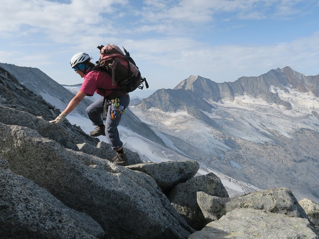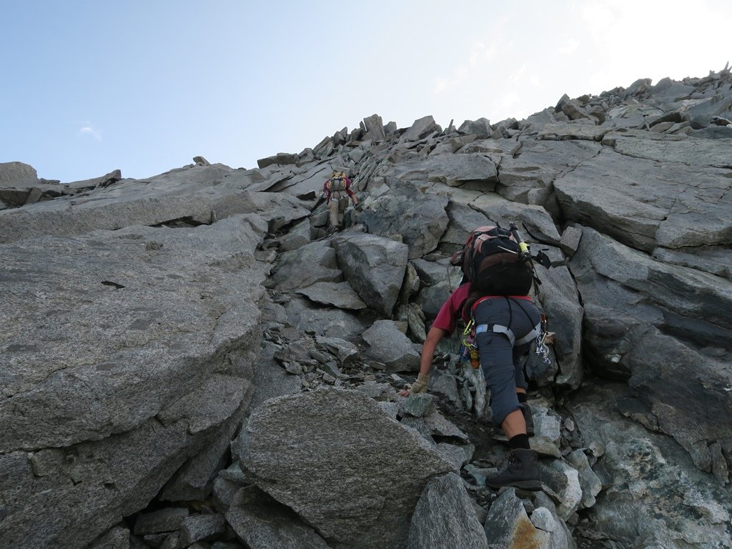 Bis der eigentliche Westgrat erreicht ist, muss im Blockgelände im 1. und 2. Grad geklettert werden.,