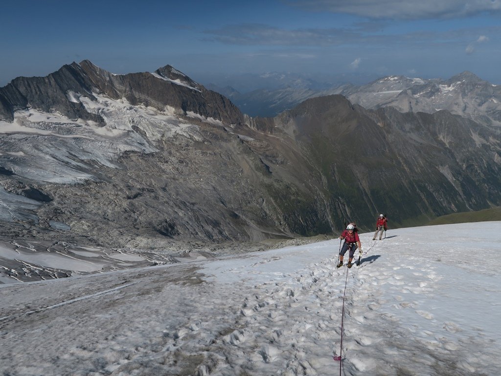 Weiter oben im Firn kommt nochmal das Seil zur Verwendung.,
