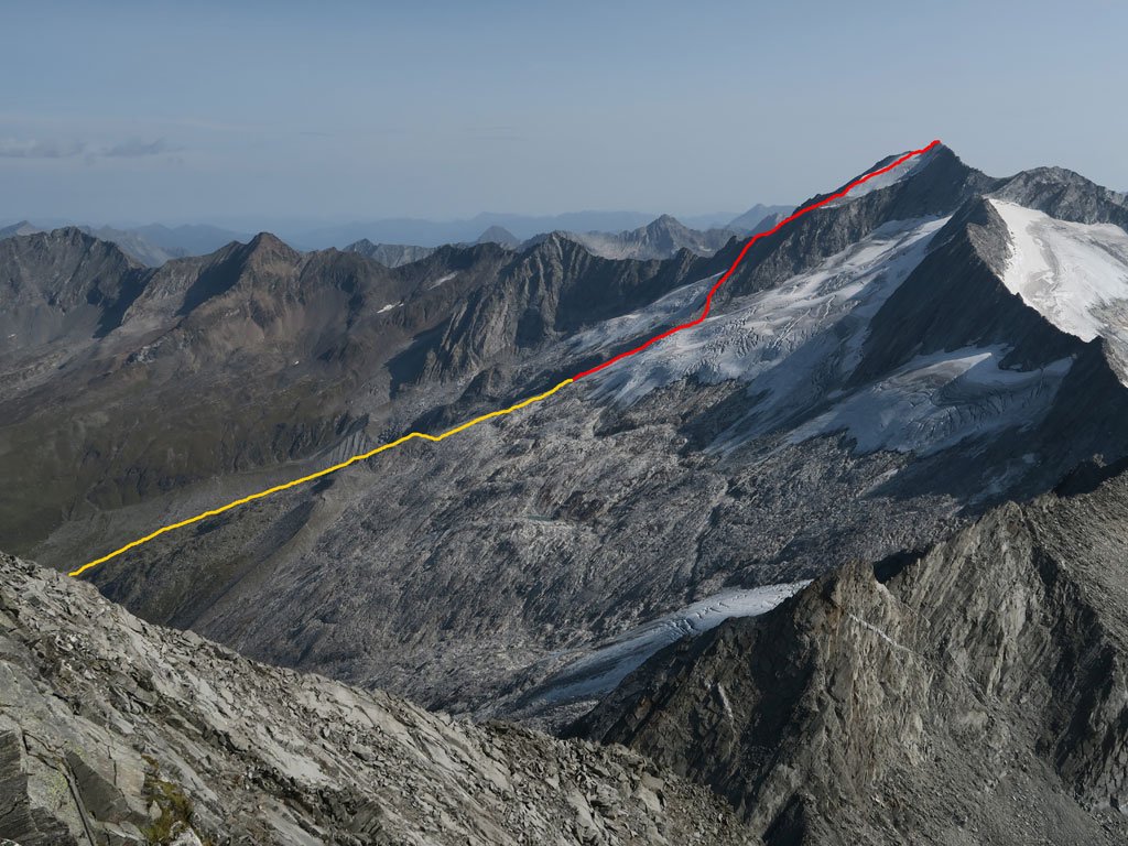 Übersicht, In Orange der Zustieg, in Rot der Gletscher- und Kletterabschnitt, Foto: Dieter Wissekal
