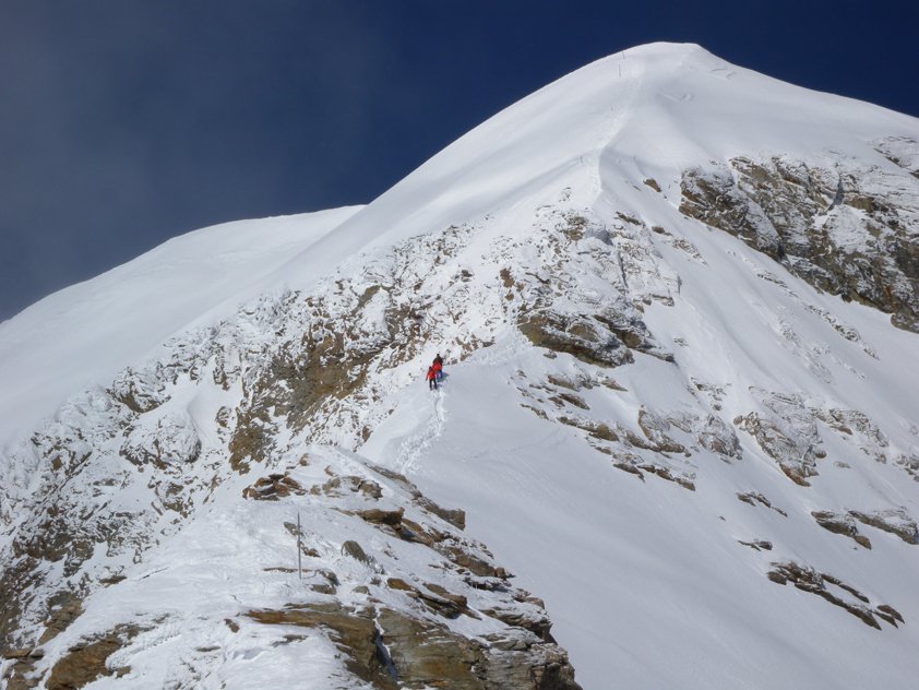 Von der Station Jungfraujoch durch den Sphinxstollen auf den Jungfraufirn und auf der gewalzten Ratrakspur in Richtung Mönchsjochhütte. Ca. 15 Min vor der Hütte reicht der Felsgrat fast bis zum Gletscher hinunter, dort zweigt man links zum Fels ab (meist ist die Abzweigung mit einer Stange markiert, Trittspuren sind meist auch vorhanden oder noch sichtbar). Der Einstieg liegt ca. auf 3650 m, man sieht oben einen Regenmesser auf dem Grat. Zuerst einfach, auf je nach Schneelage losem Geröll und kurzen, leichten Stufen aufwärts bis zum Regenmesser. Danach wird der Grat schmaler, einige Felspassagen im 2ten Schwierigkeitsgrat müssen geklettert werden (einige Eisenstangen sind als Sicherungshilfe vorhanden). Oben dann wieder auf dem Firngrat höher, am Ende auf dem schmalen Firngrat bis zum höchsten Punkt.