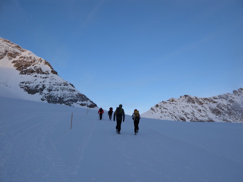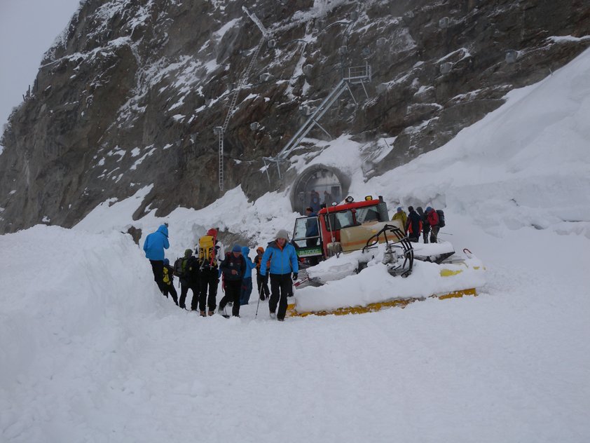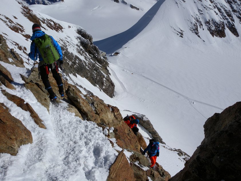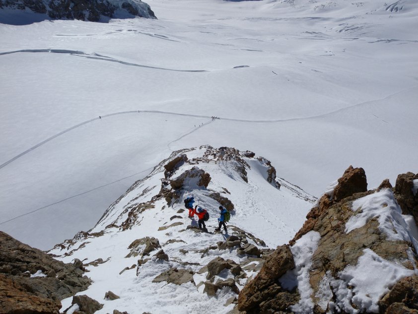 Wie Aufstieg auf dem Südostgrat hinunter zum Gletscher und zurück zum Jungfraujoch.
