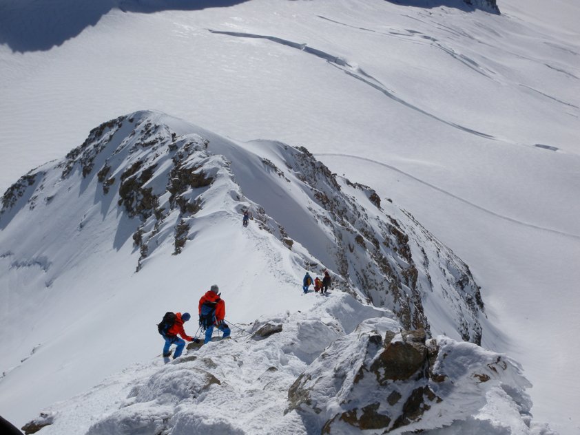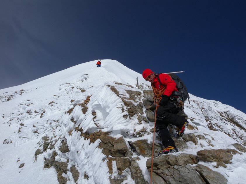 Kurze Kletterpassagen im 2ten Grad, diese sind in der Regel mit Steigeisen zu bewältigen.