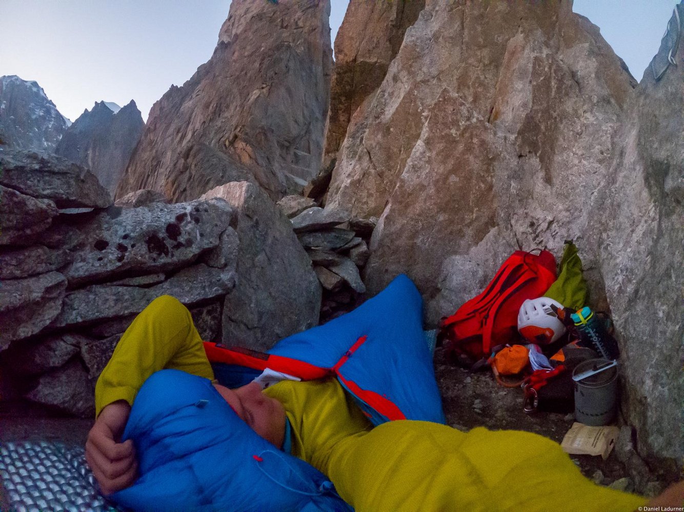 Kletterausrüstung, Helm, Cams bis BD 1, 8 Expressschlingen, Tibloc, Steigeisen, 6 Eisschrauben, 2 Eisgeräte, Schlafsack, Kocher, Isomatte, Stirnlampe und 60 m Seil