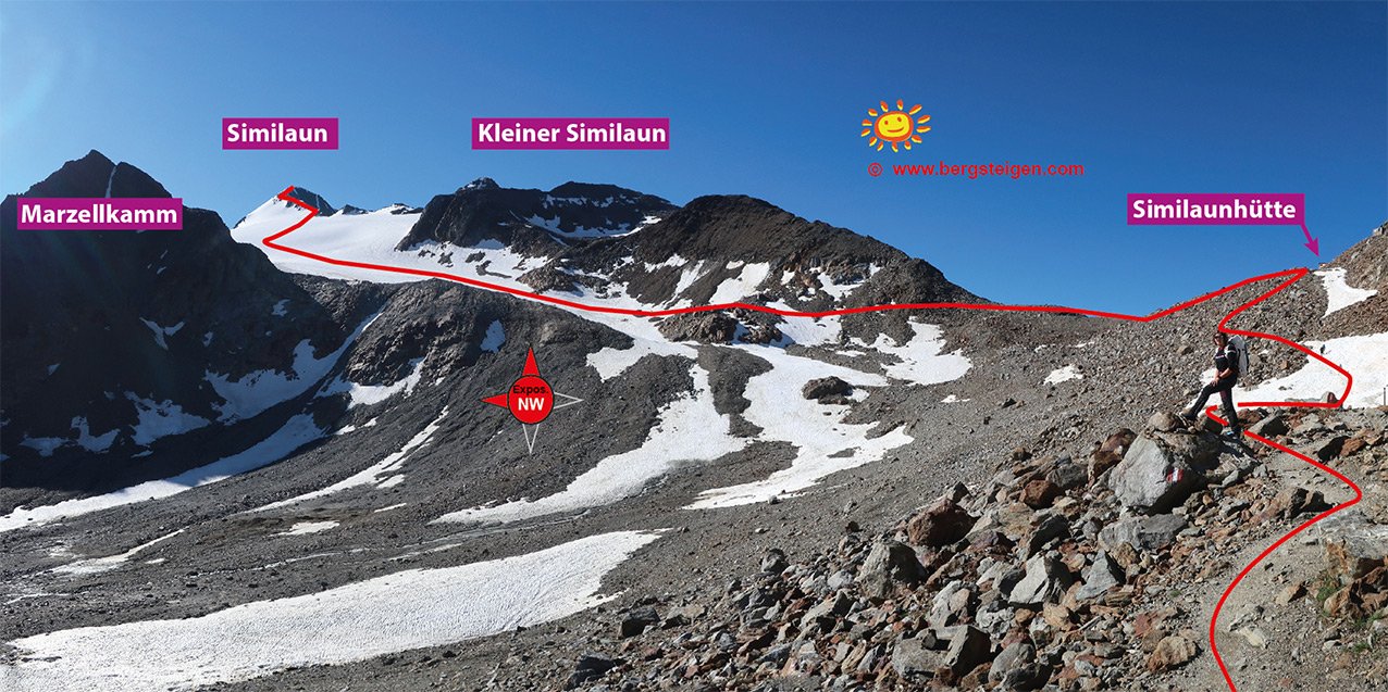 Von Vent auf dem Forstweg zur Martin Busch Hütte, dort weiter taleinwärts bis zur Similaunhütte (bis dorthin einfacher Wanderweg). Von der Similaunhütte waagrecht auf Pfadspuren nach Osten zum Gletscherbeginn. Dann auf dem flachen Gletscher, unterhalb des Kleinen Similaun vorbei aufsteigen, bis man unter den Nordwestgrat kommt. Auf dem teilweise etwas steileren Nordwestgrat hinauf zum Gipfel (kurz vor dem Gipfel gibt es eine kleine Steilstufe, die man meist leicht links überklettert). Abstieg wie Aufstieg. Wer früh dran ist und noch Reserven hat, kann über den Marzellkamm absteigen. Da kommen noch ca. 150 Hm obendrauf, da man etwas auf und ab wandert. Der Weg bis zur Marzellkammspitze (3149 m) ist nur mit Steinmännchen markiert, ab der Marzellkammspitze mit rot/weißer Markierung bis zur Martin Busch Hütte.