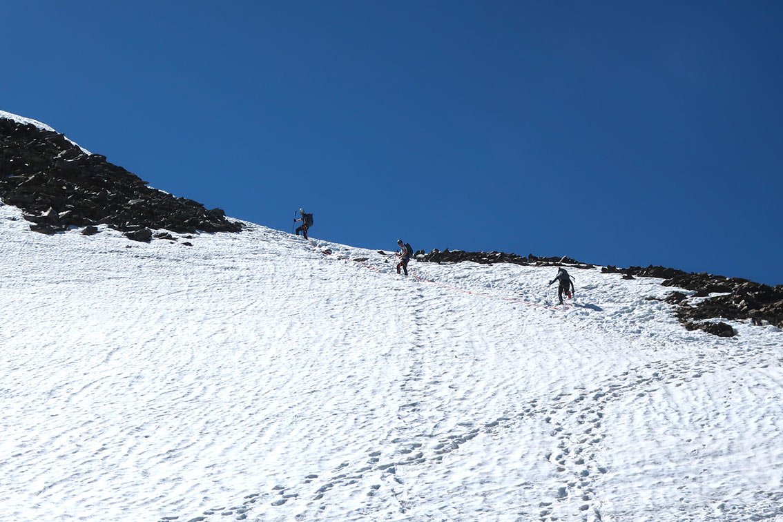 Am besten man kommt im Frühsommer, da hat man noch Firn; später in der Saison ist der Gletscher blank und der Grat ein Schotterhaufen.