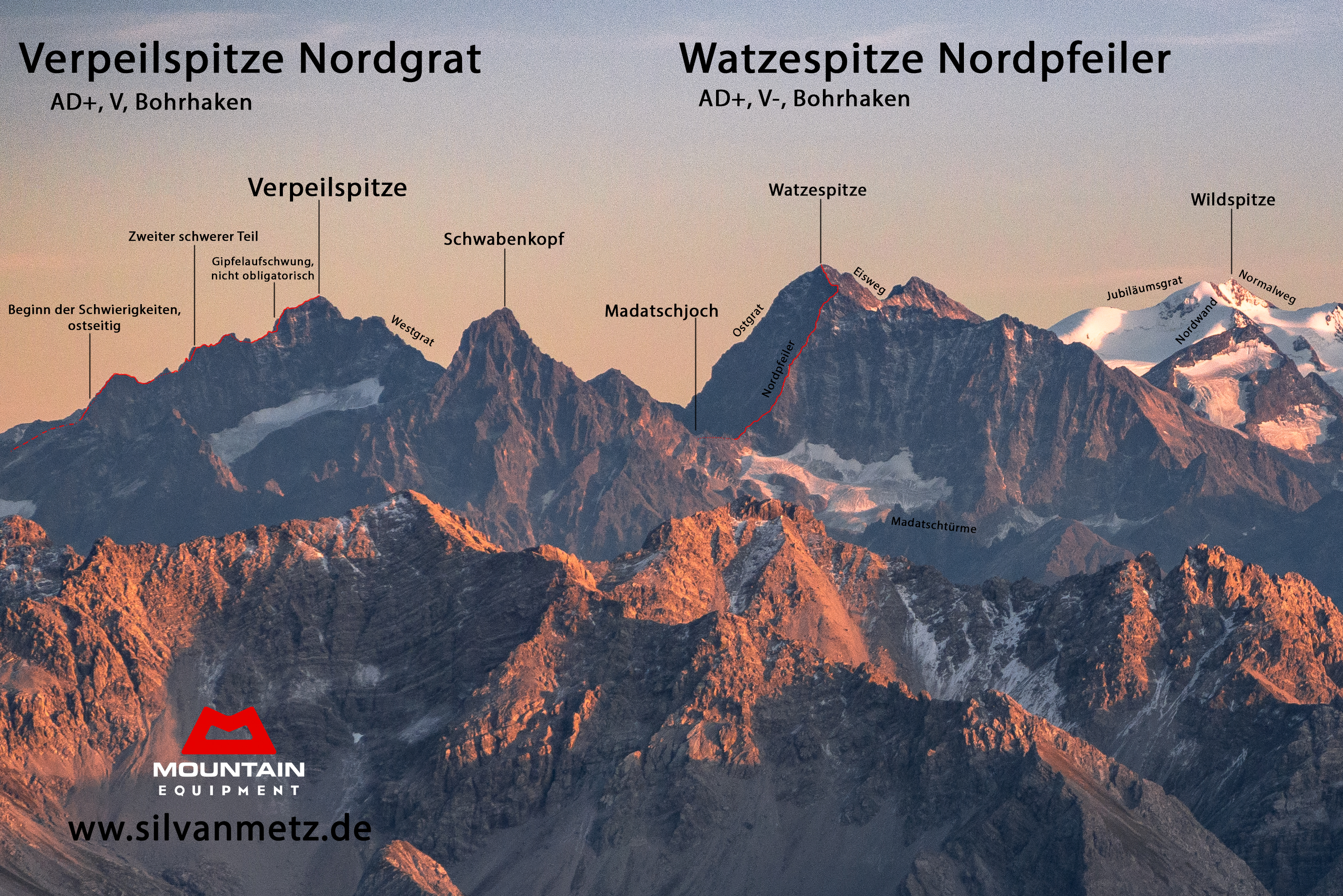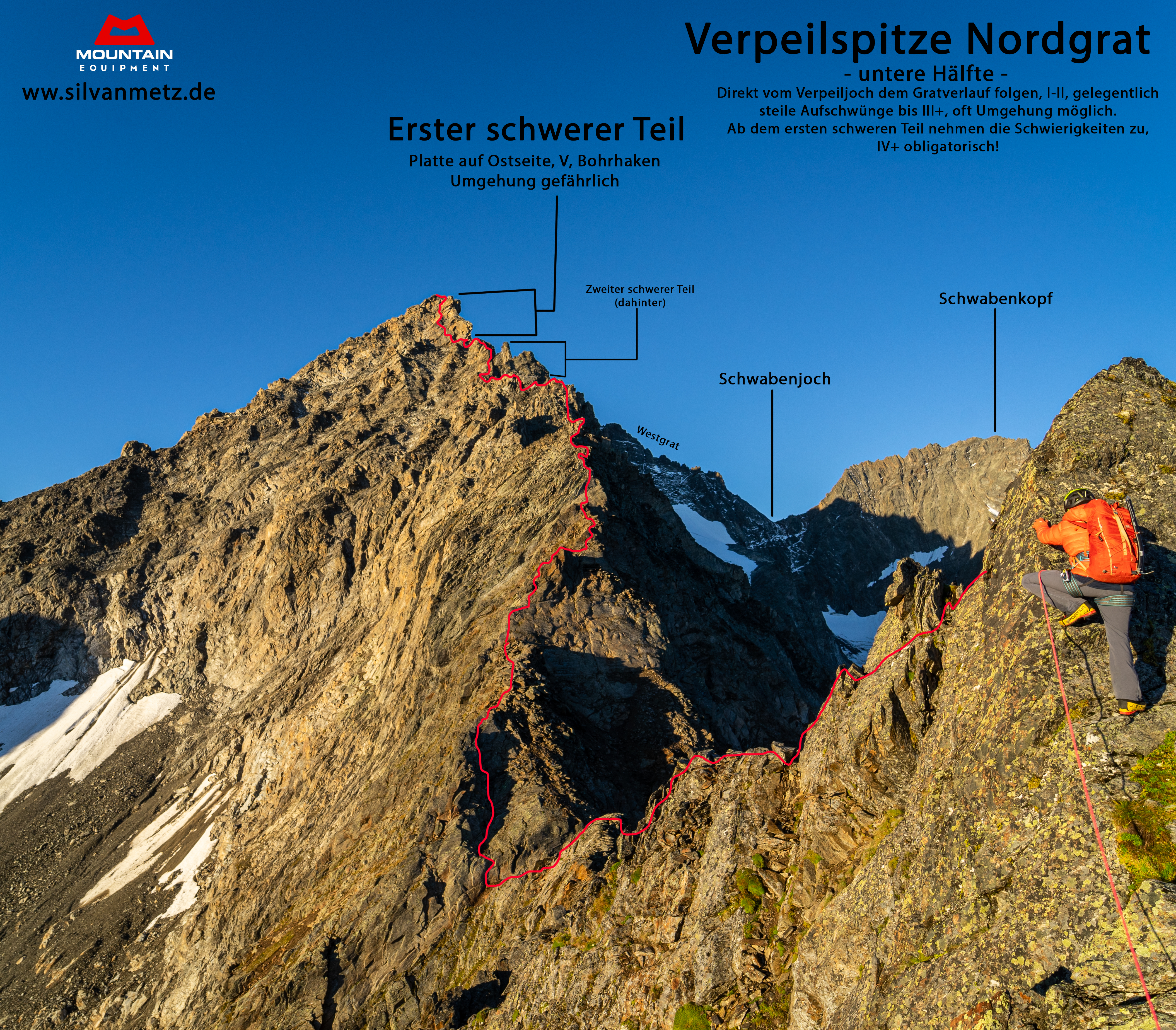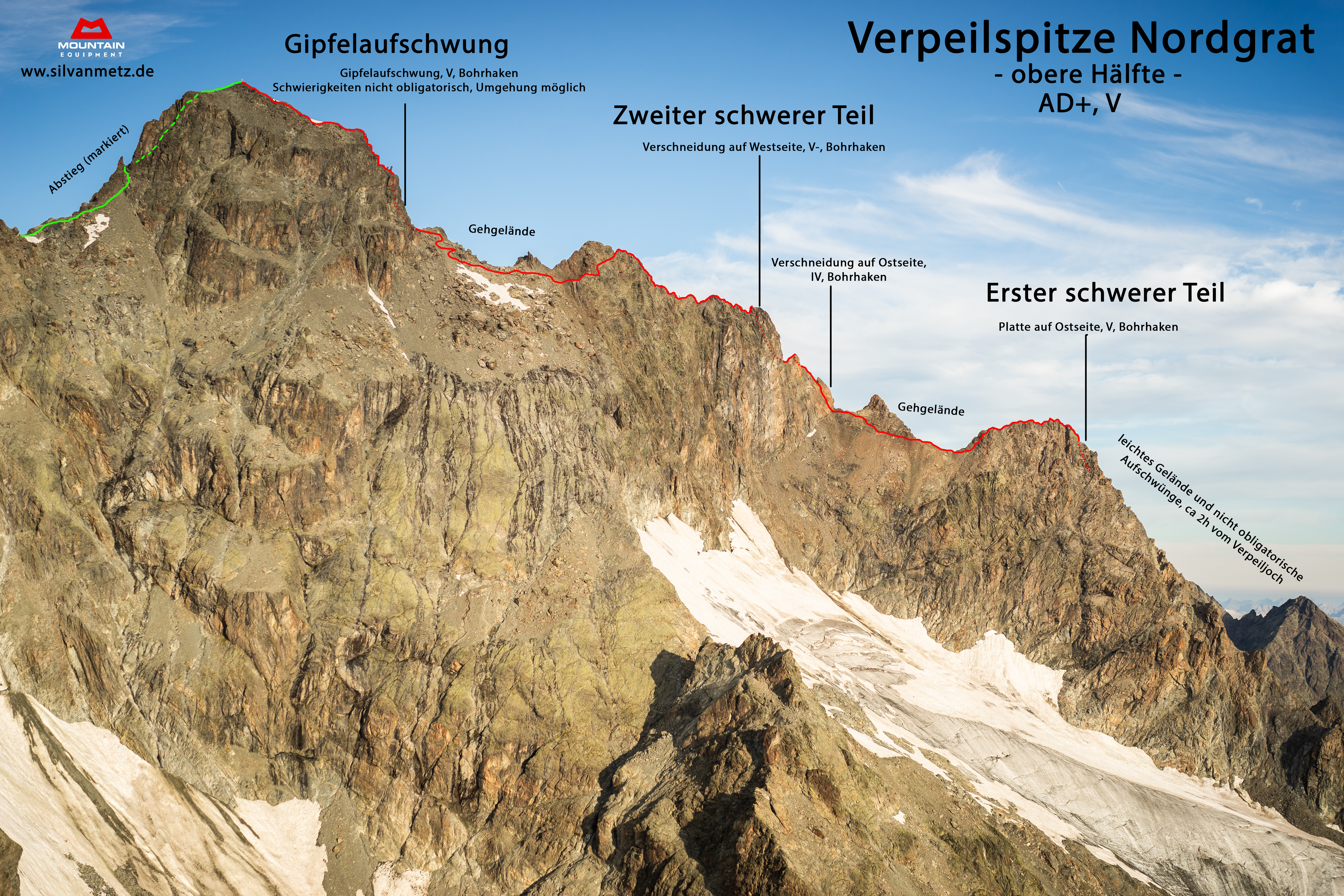Der Nordgrat der Verpeilspitze ist einer der längsten Urgesteinsgrate Tirols und steht ganz im Gegensatz zu den sonst eher leichten Touren der Ötztaler Alpen. Von Begehern wird obligatorisch der obere IV. Grad abverlangt, dafür gibt es überwiegend sehr guten Fels - zumindest bei allen Kletterstellen über dem II. Grad. Etwa 130 Bohrhaken degradieren den Grat von einer fordernden, westalpenähnlichen Tour zu einem gemütlichen Exengemetzel. Das ist schade, aber immerhin ist die Tour so auch mit leichtem Gurt und wenig Erfahrung genießbar.