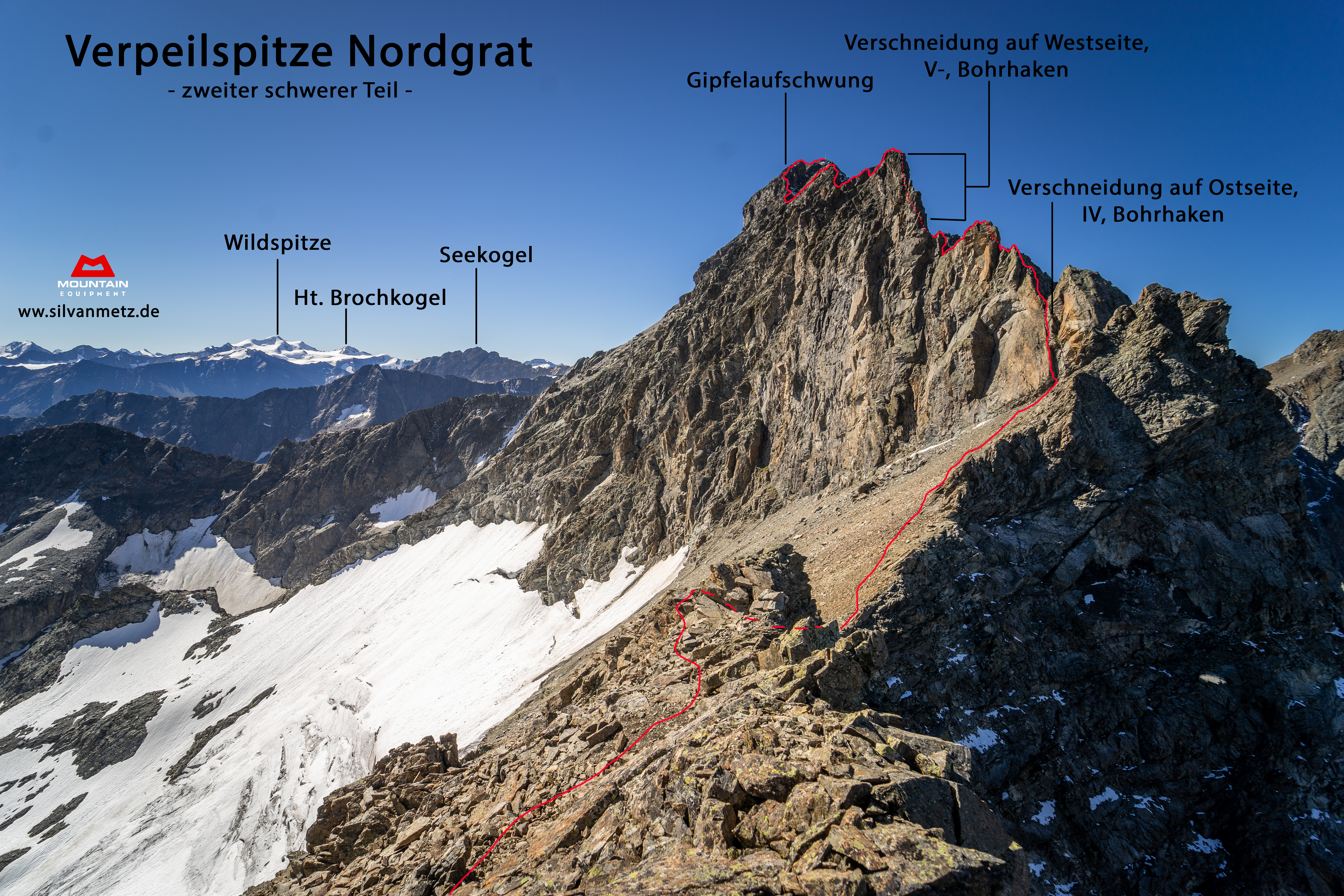 Vom Verpeiljoch zunächst über einige Türme und Zacken nach Süden. Dabei immer an der Gratkante bleiben, einige kleine Abkürzer auf der Ostseite sind offensichtlich. Nach einer tiefen Scharte steilt der Grat auf, man folgt nun konsequenter der Gratkante. Die vielen Bohrhaken weisen den Weg. Achtung, teilweise stecken die Haken hier nur in großen herumliegenden Blöcken! Je höher man kommt, desto öfter wird der III. Grad erreicht. Schließlich leiten die Bohrhaken beeindruckend zahlreich über zwei steile Türme mit netten Kletterstellen im unteren IV. Grad. Eine Umgehung auf der Ostseite ist zwar brüchig, sollte aber trotzdem ungefährlich möglich sein. Nach den Türmen öffnet sich an einer Abflachung der Blick zum Gipfel, bis hier ca 2h vom Verpeiljoch.