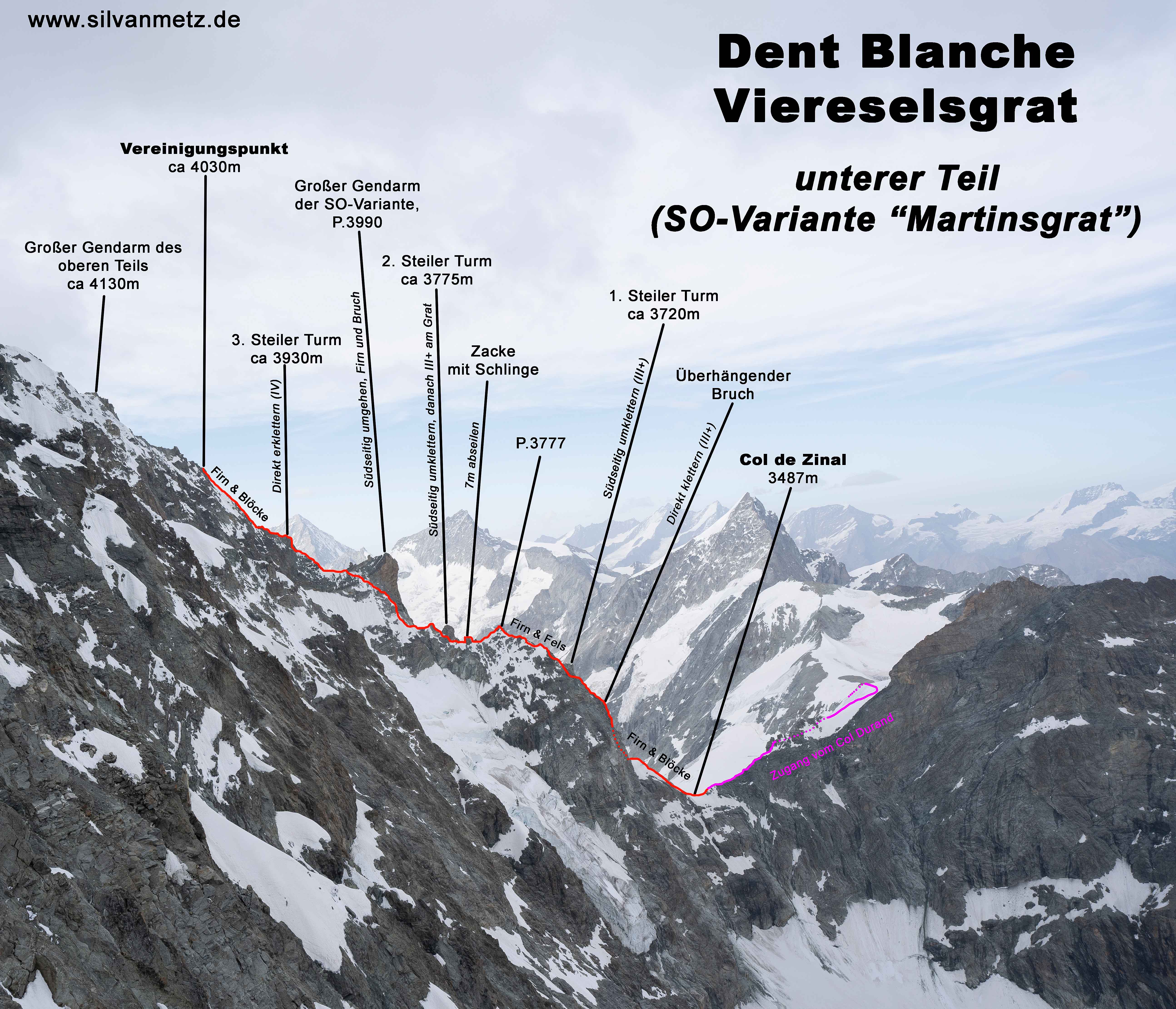 2) Vom Col de Zinal (siehe Zustieg) über den Südostsporn zum Vereinigungspunkt ("Martinsgrat"). Siehe Topo.