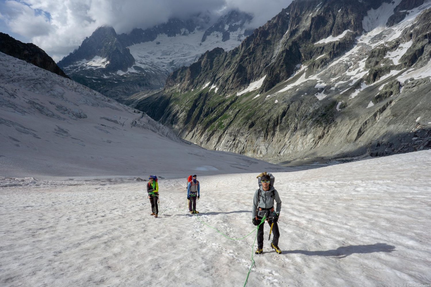 Direkt vom Gipfel auf dem Normalweg Richtung Süden- zuerst über Schnee, dann über einen felsigen Grat abkletternd in eine markante Gletschermulde. Diese nach Westen queren zur Whymperrippe. Über Fels runter (Abseilstellen) und neuerliches Queren einer 40-45° steilen Eisflanke nach Westen zu den Reposoirfelsen. Den Grat abklettern oder abseilen. Dann durch ein Gewirr aus Spalten und Seracs in leichteres Gelände. Am Ende des Gletschers schottrig zur Boccalatte Hütte (2.804 m- 4 Stunden. Achtung: Hütte nicht immer offen! Winterraum…). Von dieser über einen steilen Möränenrücken teils mit Fixseilen gesichert und Stahlleitern steil runter ins Val Ferret (2 Stunden). (siehe Karte und Satelitenbild!)