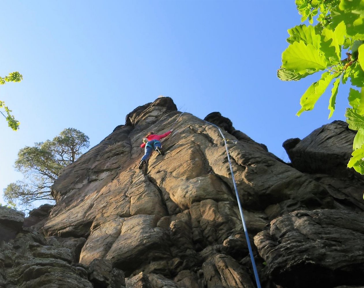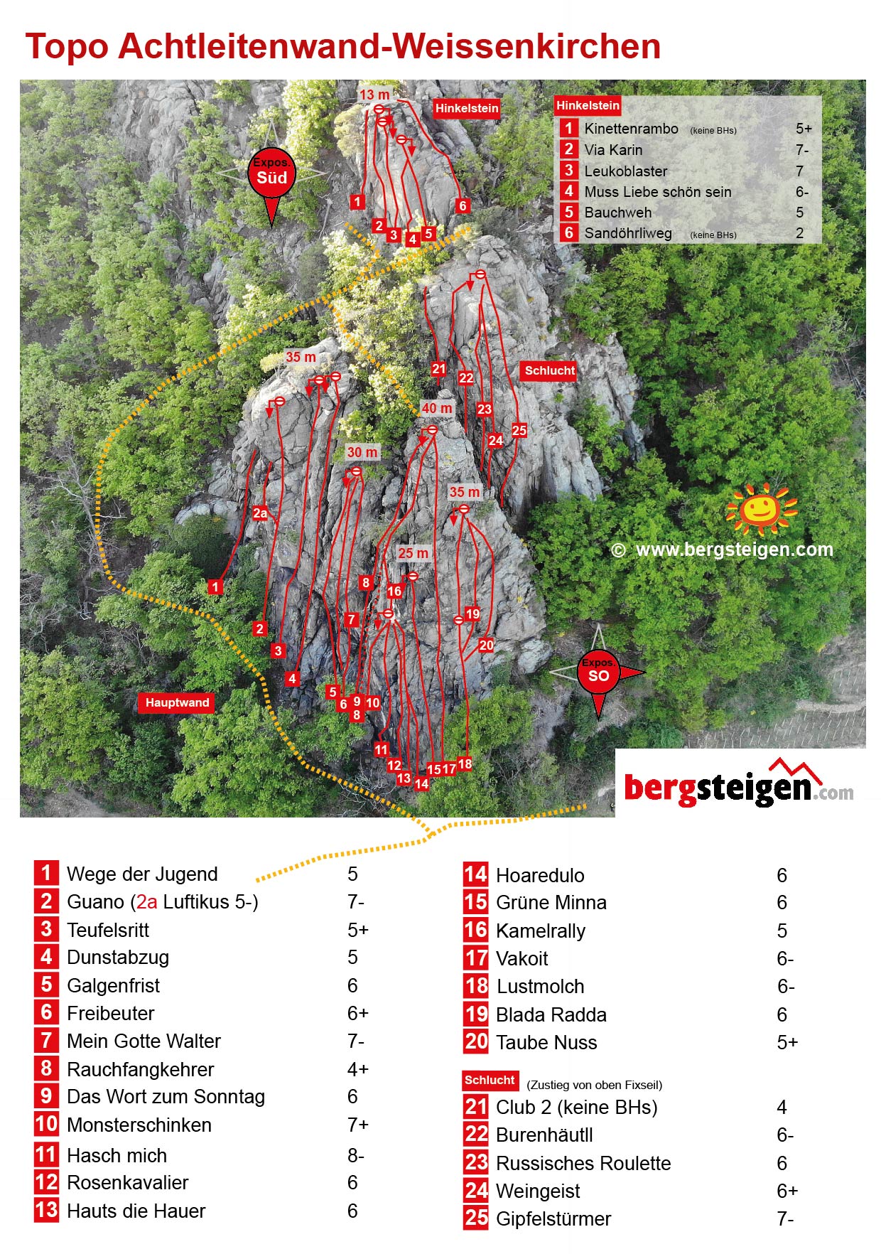 Die Achleitenwand besteht aus drei Sektoren: Hauptwand, Hinkelstein und Schlucht. Am lohnendsten ist sicher die Hauptwand, der Hinkelstein bietet dafür eine schönere Aussicht.