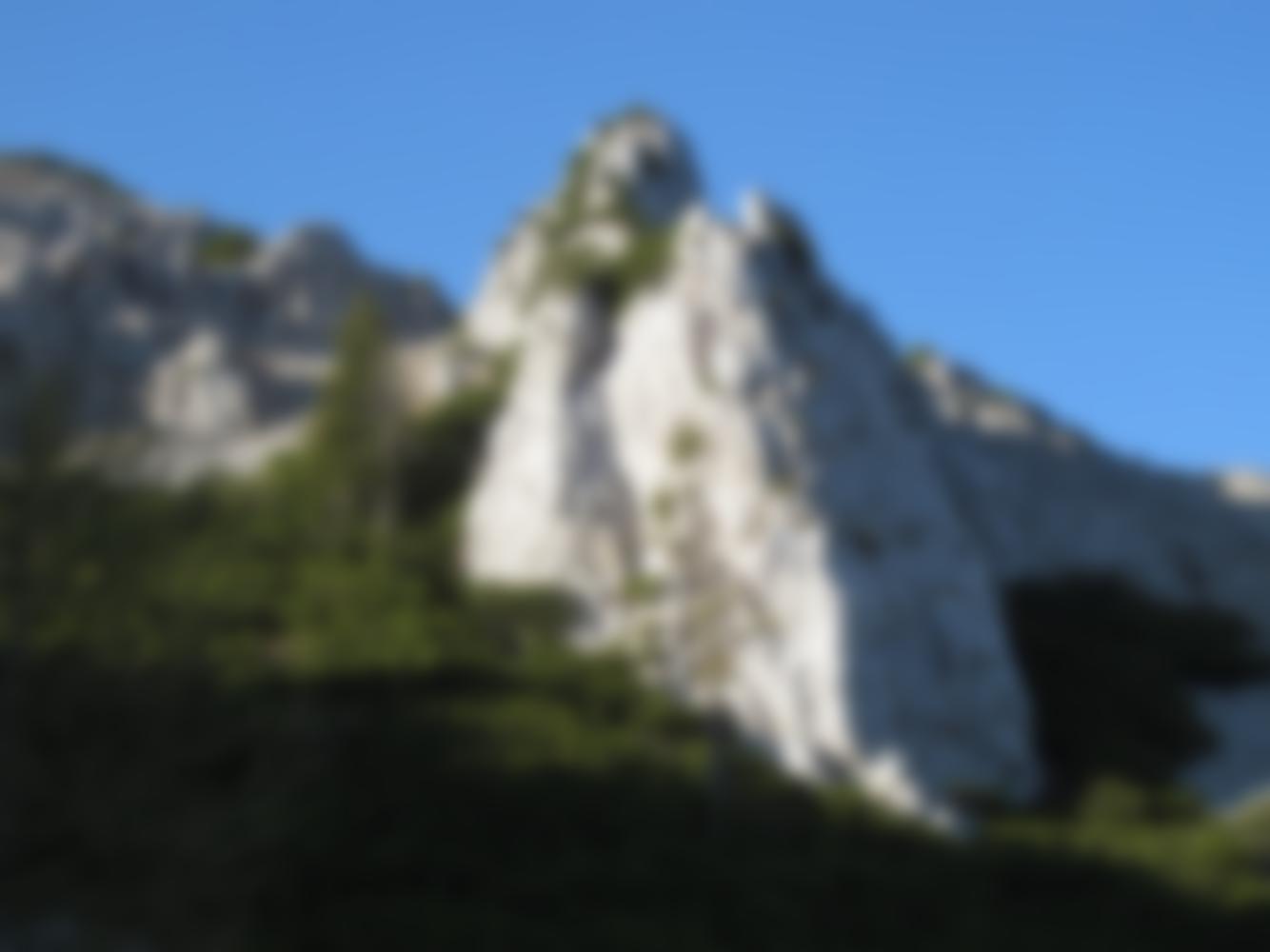 Alternativ kann man bei den ersten Latschen an der Waldgrenze den Weg nach rechts verlassen. Dann geht man nach ca. 40m gerade hinauf in eine Latschengasse (kleine Steinmannderl) und zum Schluß über loses Blockwerk und Geröll zum Fels.