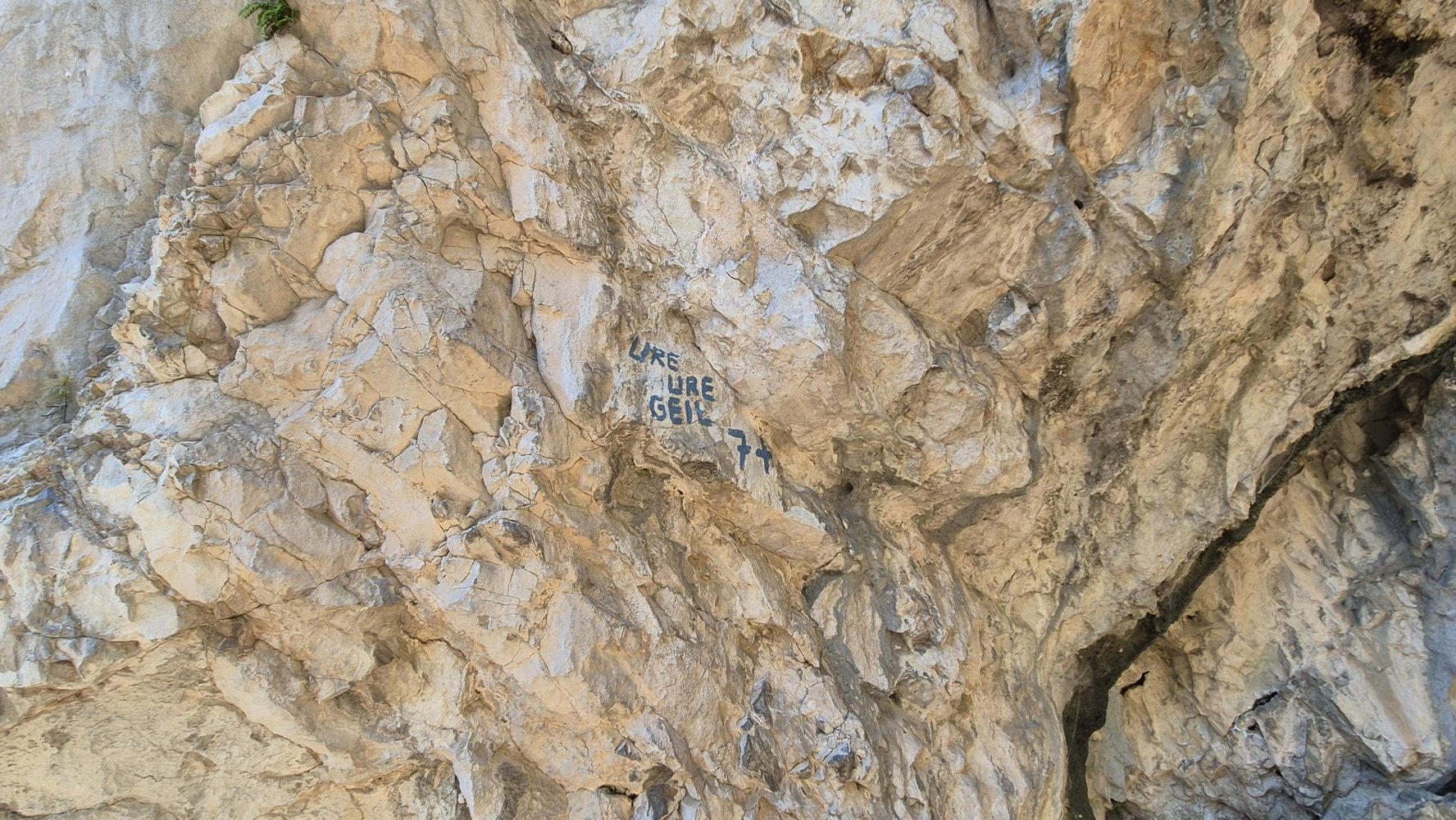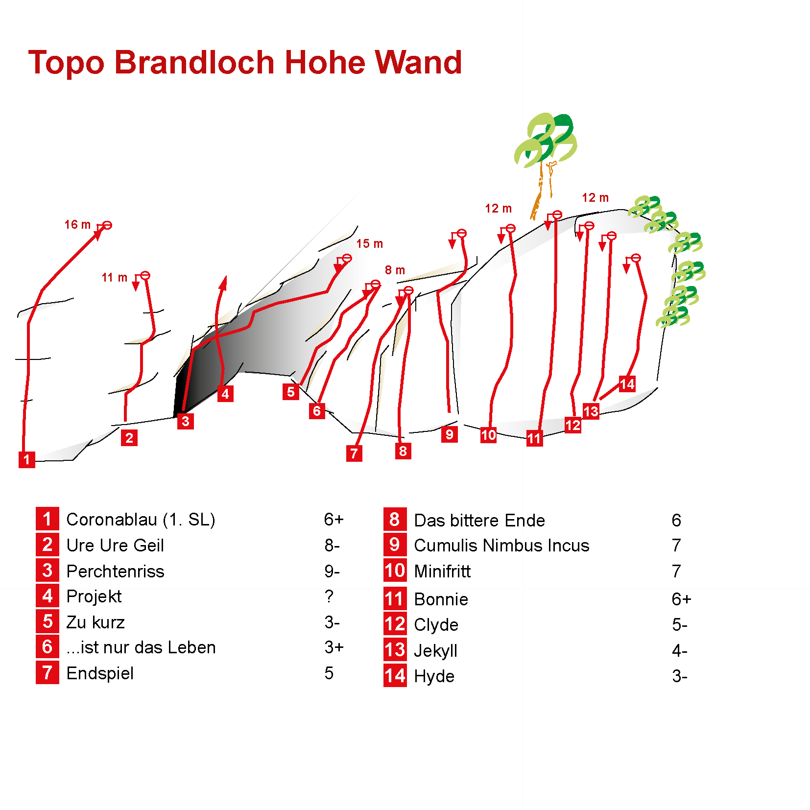 Vom Parkplatz auf der oberen Forststraße bis diese eine Rechtskehre macht. In der Kehre führt links ein Weg zum Wandfußsteig hinauf. Auf dem Wandfußsteig nach links (Südwesten) zur markanten Höhle (links von ihr für die blau angeschriebene Route "Ure Hure Geil 7+ hinauf) kurz danach erreicht man die markante Brandloch (Höhle mit Bankerl), das sich ca. 50 Meter vor dem blau angeschriebenen Tirolersteig 2+ befindet.