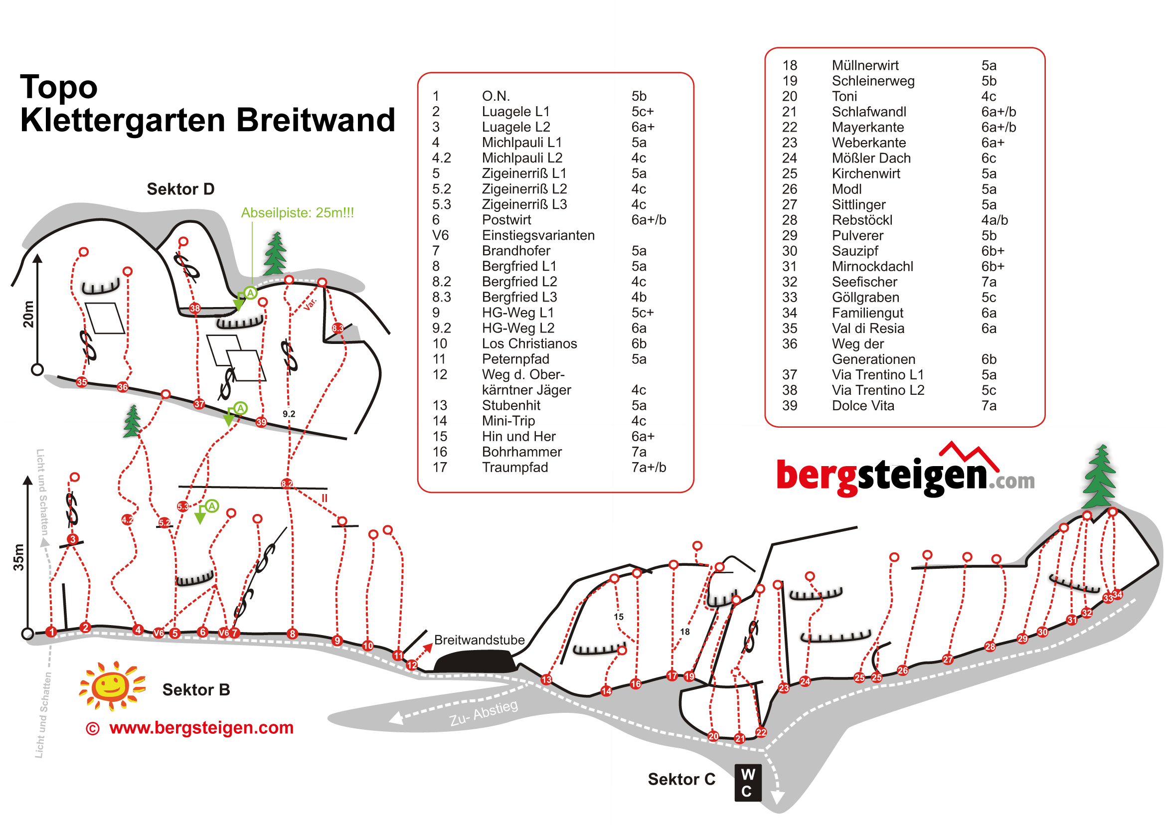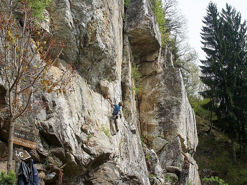 Kletterer, die das Mehrseillängen- Klettern erlernen wollen, werden hier ausgezeichnete Voraussetzungen finden. Die oben angesprochen längeren Mehrseillängentouren findet ihr auch bei uns auf der Seite. Der Klettergarten gliedert sich grob in 4 Teilgebiete: Sektor A ist der reine Mehrseillängen- Sektor. Sektor B, C und D sind Sportklettersektoren, wobei D über die B liegt. Will man D erreichen, muss man vorher über bestimmte Routen von B klettern.