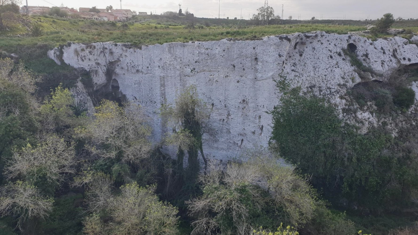 Vom Parkplatz hier führt ein Weg in den Canyon hinunter, vor der Brücke links am Grund des Canyons zur Wand.