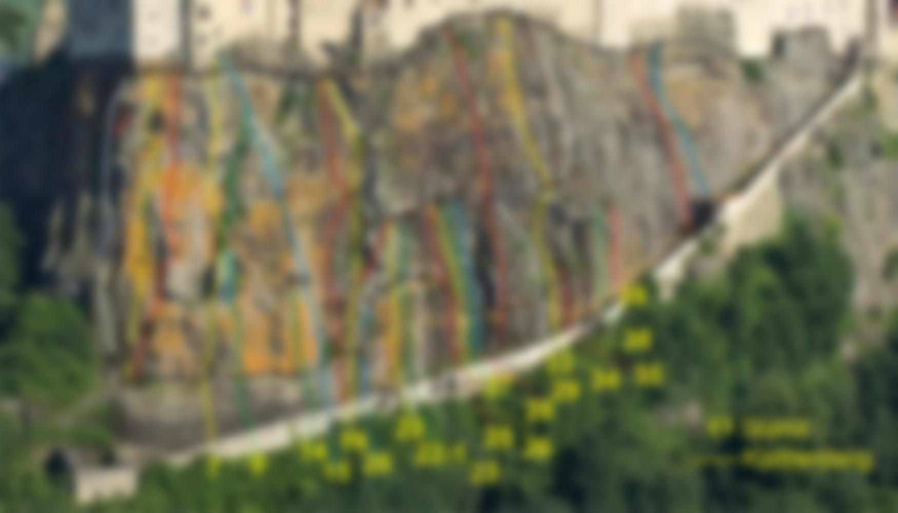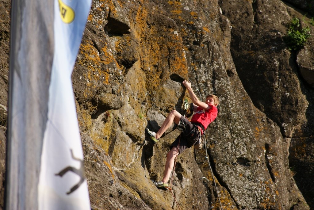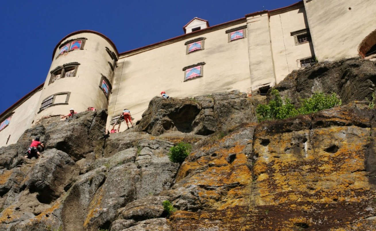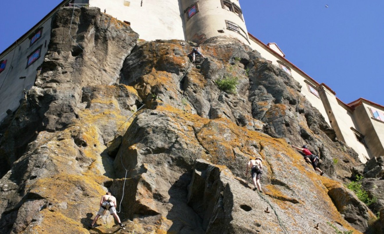 Das Klettern am Burgfelsen ist etwas besonderes: durch ein mächtiges steinernes Tor gelangt man auf den historischen Eselsteig. Von dort aus kann man auf über 10.000 qm Basalttuffgestein rd.40 Ein- und Mehrseillängenrouten zur Burg hinaufklettern. Der Klettergarten ist nicht öffentlich zugänglich, man muss sich vorher beim Hochseilgarten an der Nordseite der Burg beim Burglift anmelden und einen kleinen Obulus: Tagespreis: AV, NF-Mitglieder 8,-; Kinder bis 18 Jahre 5,-, sonst 10,- Euro bezahlen.