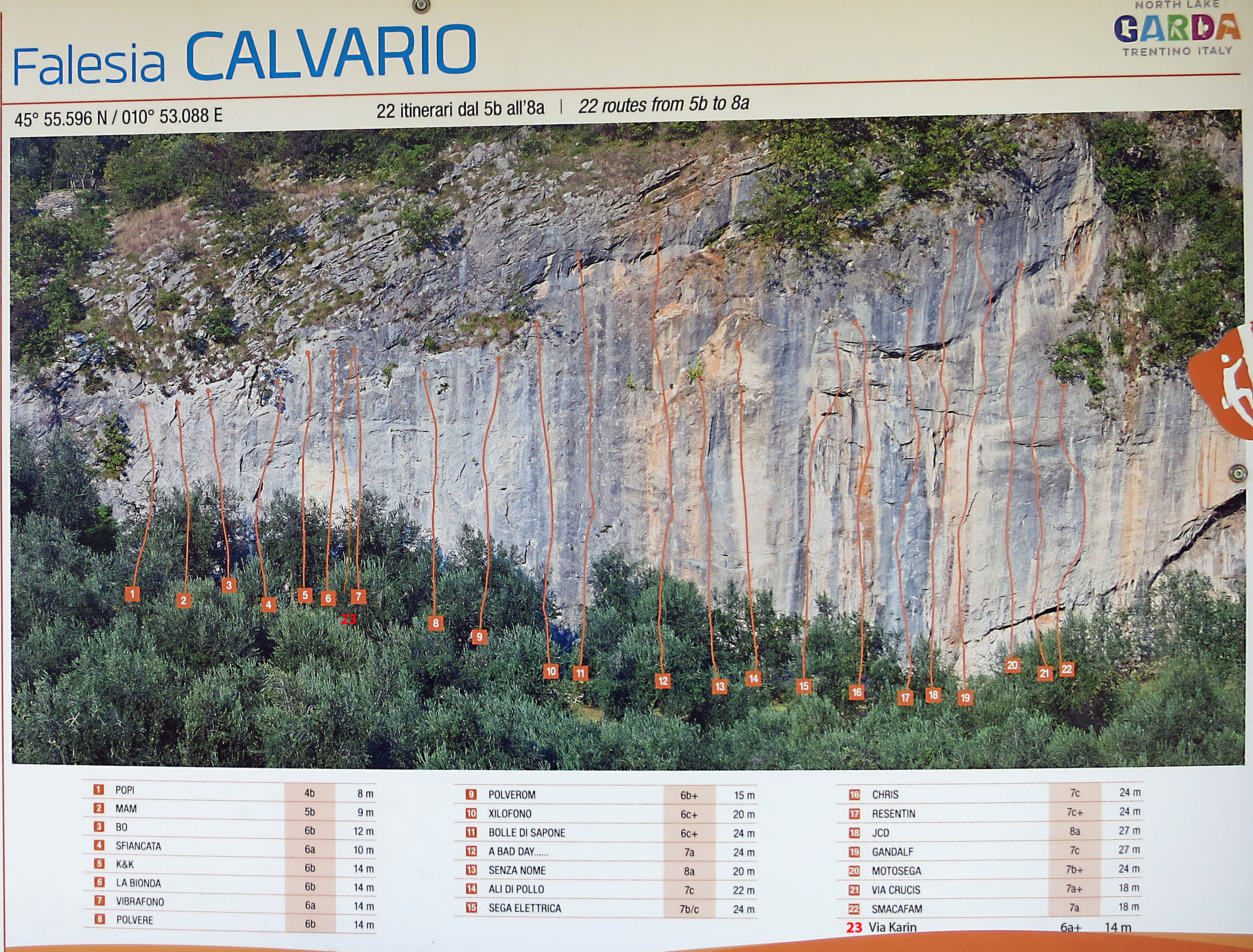 Kleiner aber feiner Klettergarten vor Laghel eingebettet in Olivenheinen. Die Routen sind relativ kurz und auch technisch anspruchsvoll. Der Einstiegsbereich ist Picknick und Kinderfreundlich. Der Klettergarten ist ab Mittag im Schatten.