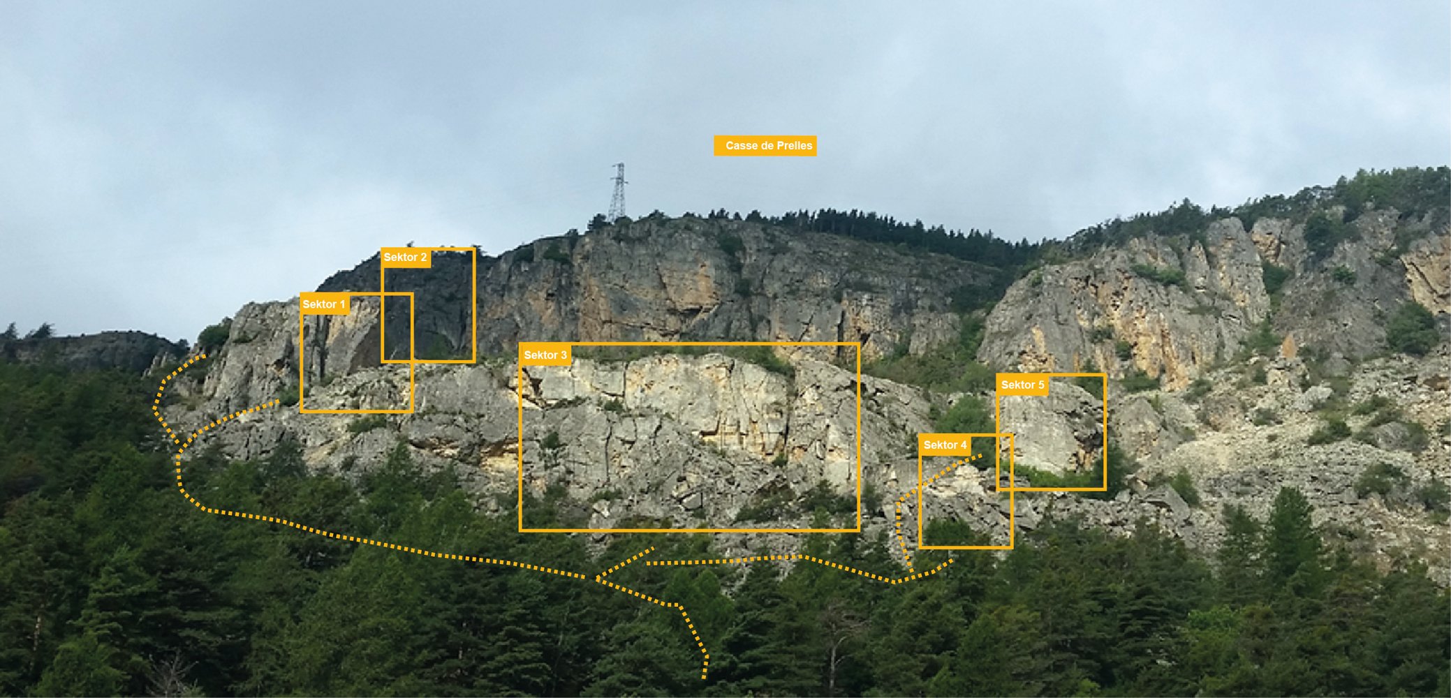 - Sektor 3: Les resauts: Liegt in der Mitte und hat auf 2 Ebenen 28 Routen von 4c bis 6b, mit Schwerpunkt 5a-c