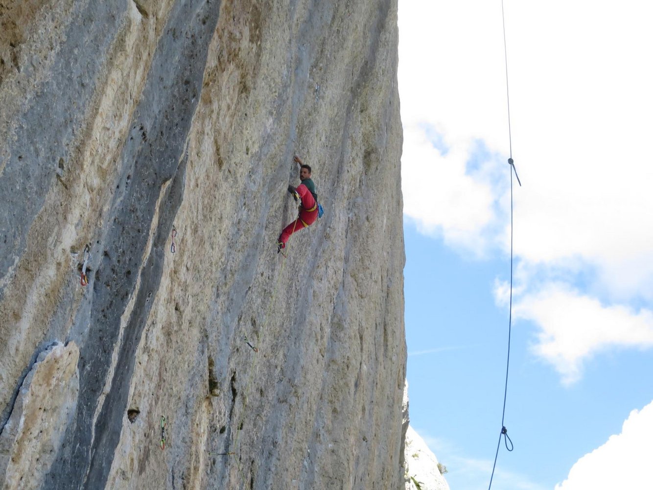 Bolts, aber weite Abstände. Es gibt auch Trad-Routen, die man selber absichern muss.