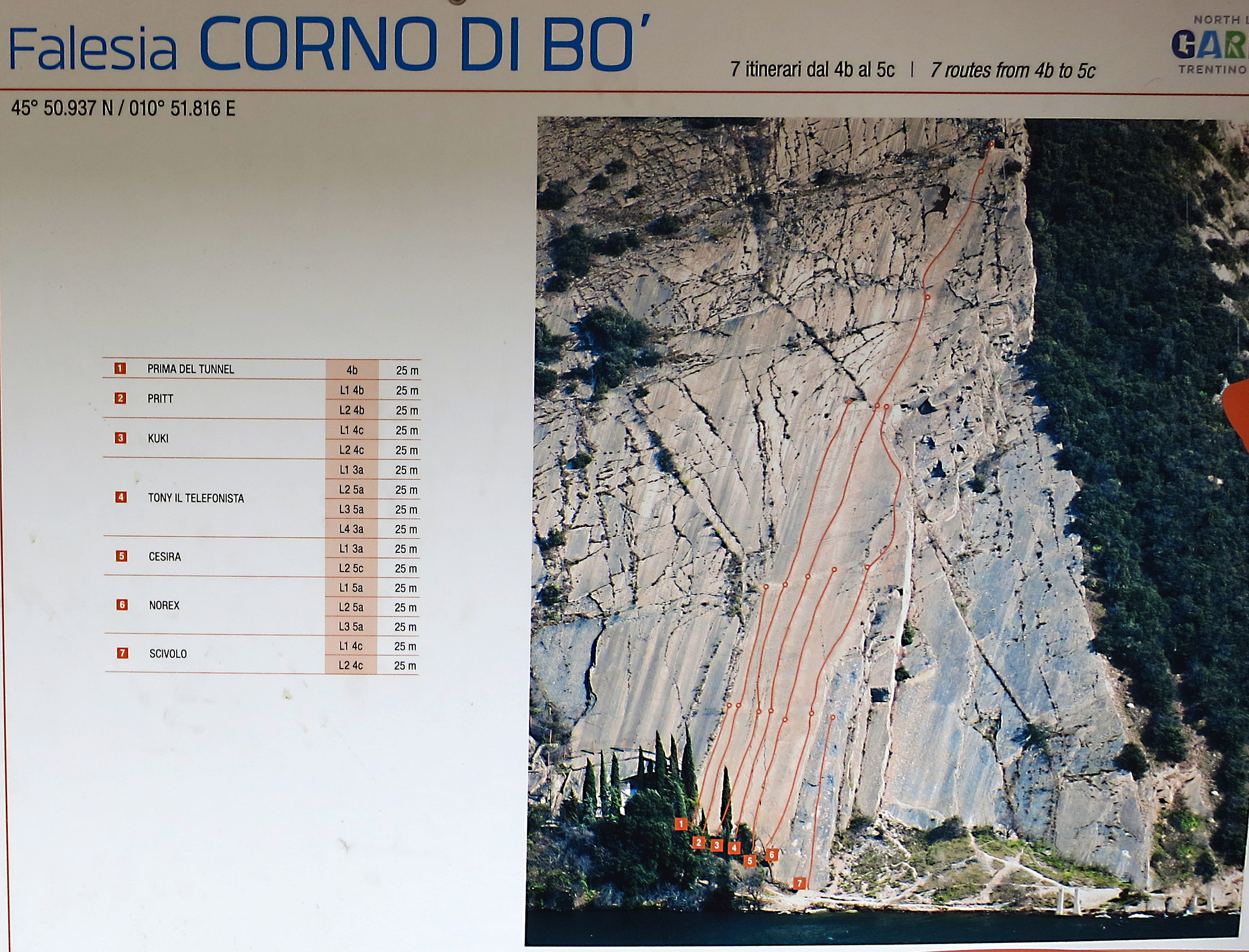 Sieben Touren auf einem Plattenpanzer, der direkt in den Gardasee abfällt. Griffe gibt es kaum, doch das stöhrt die Kletterer aus Arco wenig. Die Platten sin der perfekte Platz, um seine Kletterschuhe auf Reibung zu testen. Die Touren sind ein bis vier Seillängen lang.