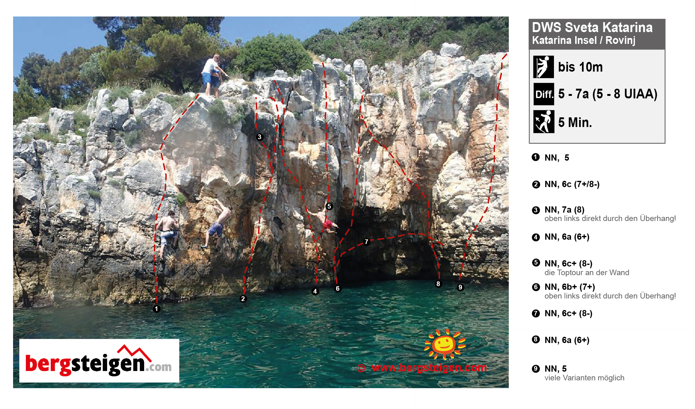 Auf der Insel Katarina nahe Rovinj gibt es einen sehr lohnenden Deep Water Soloing Spot. Das Wasser ist meist tief genug (trotzdem vorher auschecken!!!) und es gibt viele Boulder mit unterschiedlichen Schwierigkeiten und Höhen!