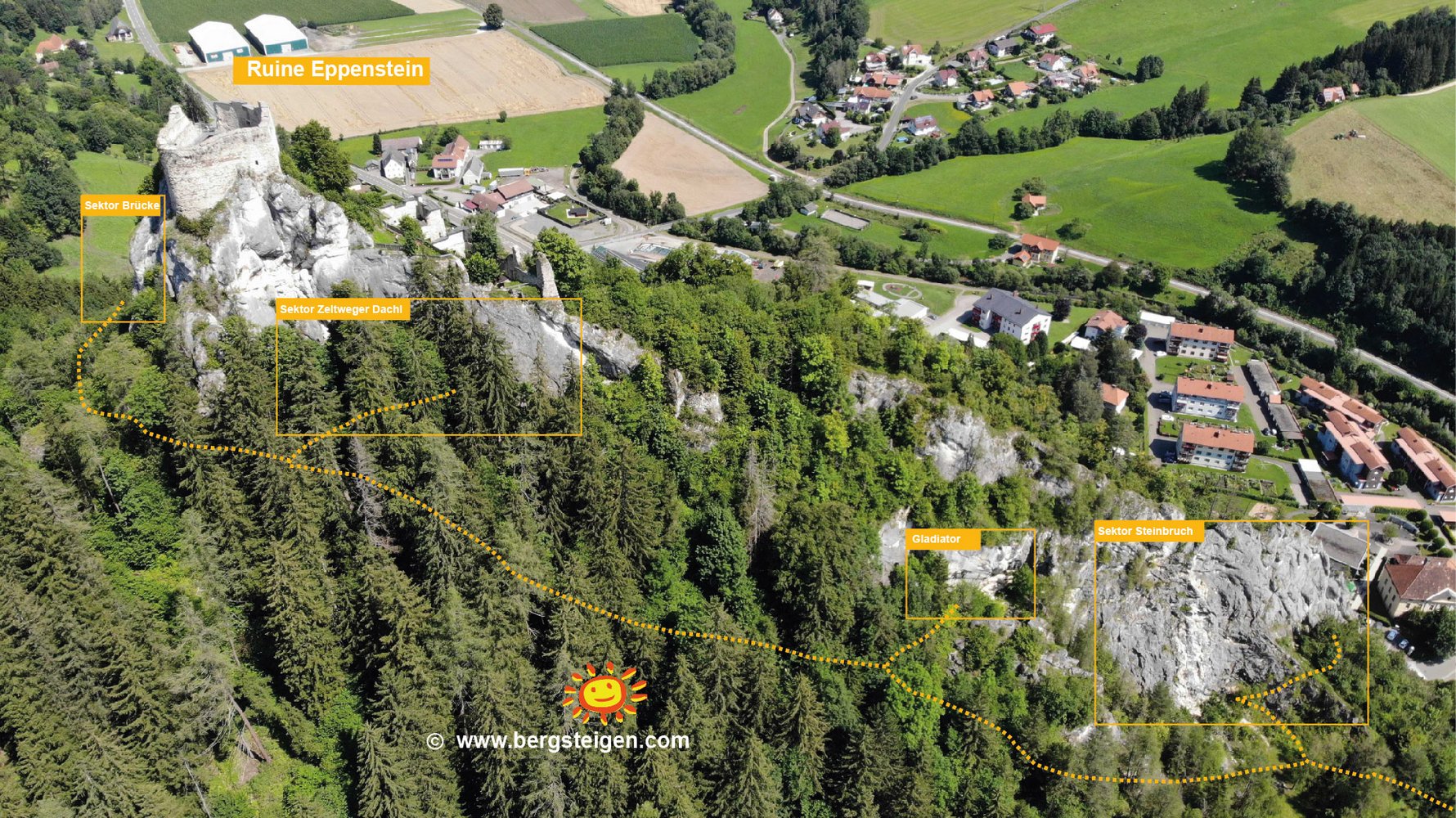 Interessanter Klettergarten unterhalb der Ruine Eppenstein. Der Klettergarten teilt sich in 4 Sektoren, Steinbruch, Bereich Gladiator, Zeltweger Dachl bis Pink Panther und Brücke. Der Sektor Steinbruch ist gut für Anfänger und Kurse, im Sektor Gladiator waren kurze, schwierige Touren, im Sektor Zeltweger Dachl-Pink Panther sind die Touren angeschrieben. Der westseitige Sektor bei der Brücke ist recht neu und bietet rd. 9 Touren im Schwierigkeitsgrad 6-8.