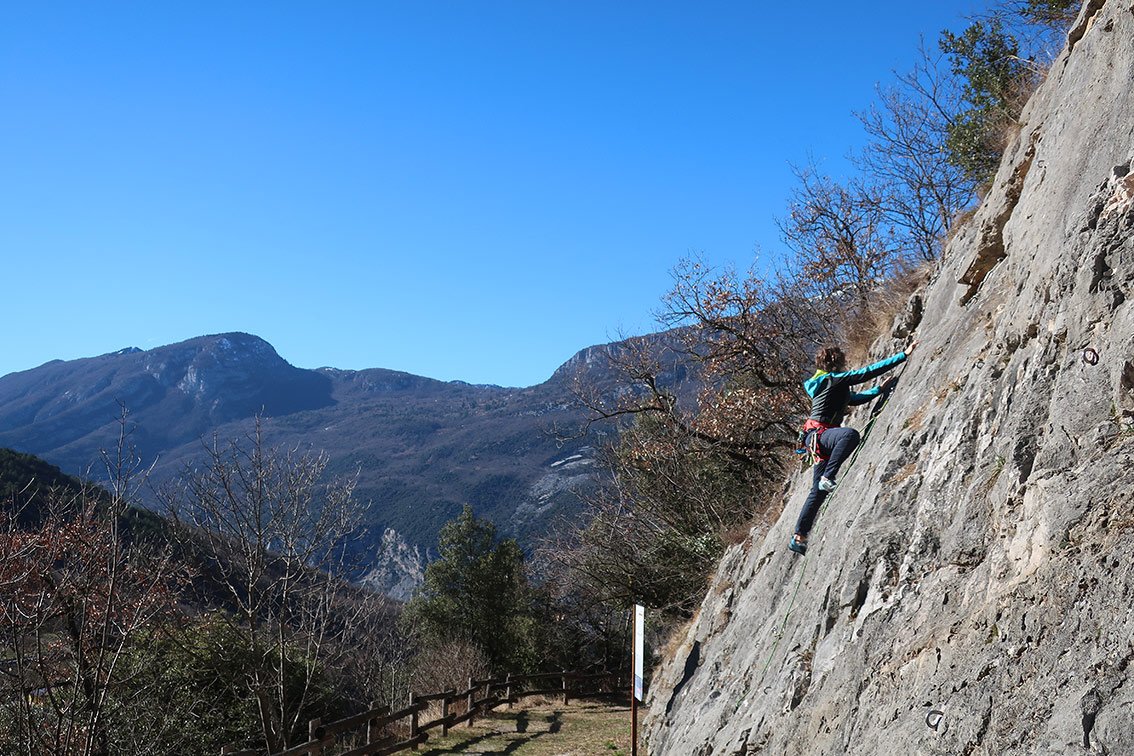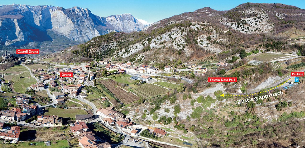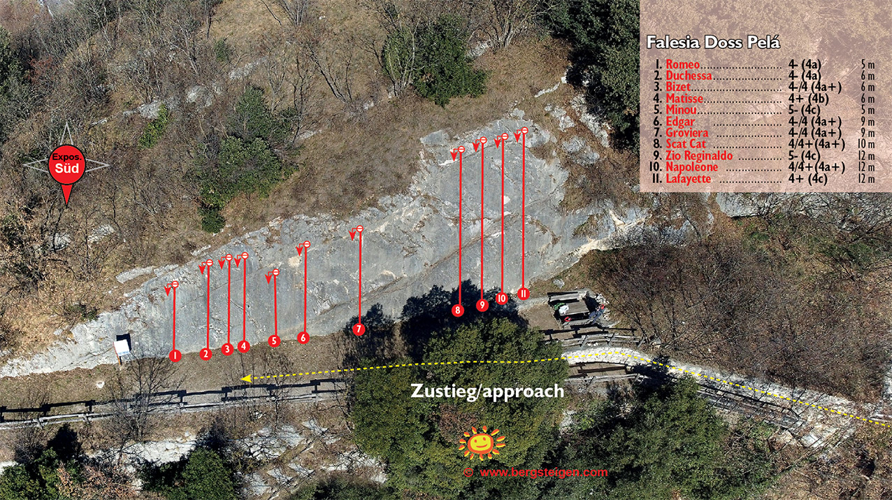 Dosss Pela ist ein Mini-Klettergarten an der Rückseite eines Tunnels. Es gibt dort 11 einfache, plattige, sehr kurze Routen, die perfekt mit Bohrhaken abgesichert sind. Der Einstiegsbereich ist eben, es gibt dort Bänke, die Lokation erinnert an einen schönen, sonnigen Picknickplatz. Für kleine Kinder sind die Routen fast etwas zu technisch (glatt). Der Klettergarten eignet sich sehr gut für Seiltechnick Training und Ähnliches. Wer dort "nur" klettern will, ist schnell fertig.