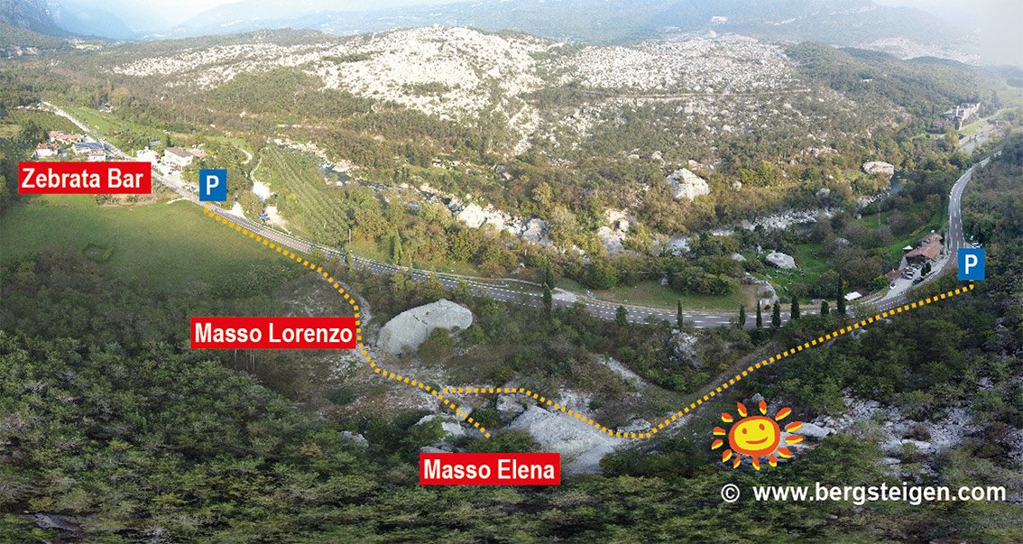 Von Pietramurata in Richtung Arco bis man nach einer markanten Fischzucht zur Bar "Parete Zebrata" kommt und in diesem Bereich parkt. Man kann auch etwas weiter üdlich beim Hochseilgarten parken. Öffis: Mit dem Bus zur Bar Parete Zebrata.