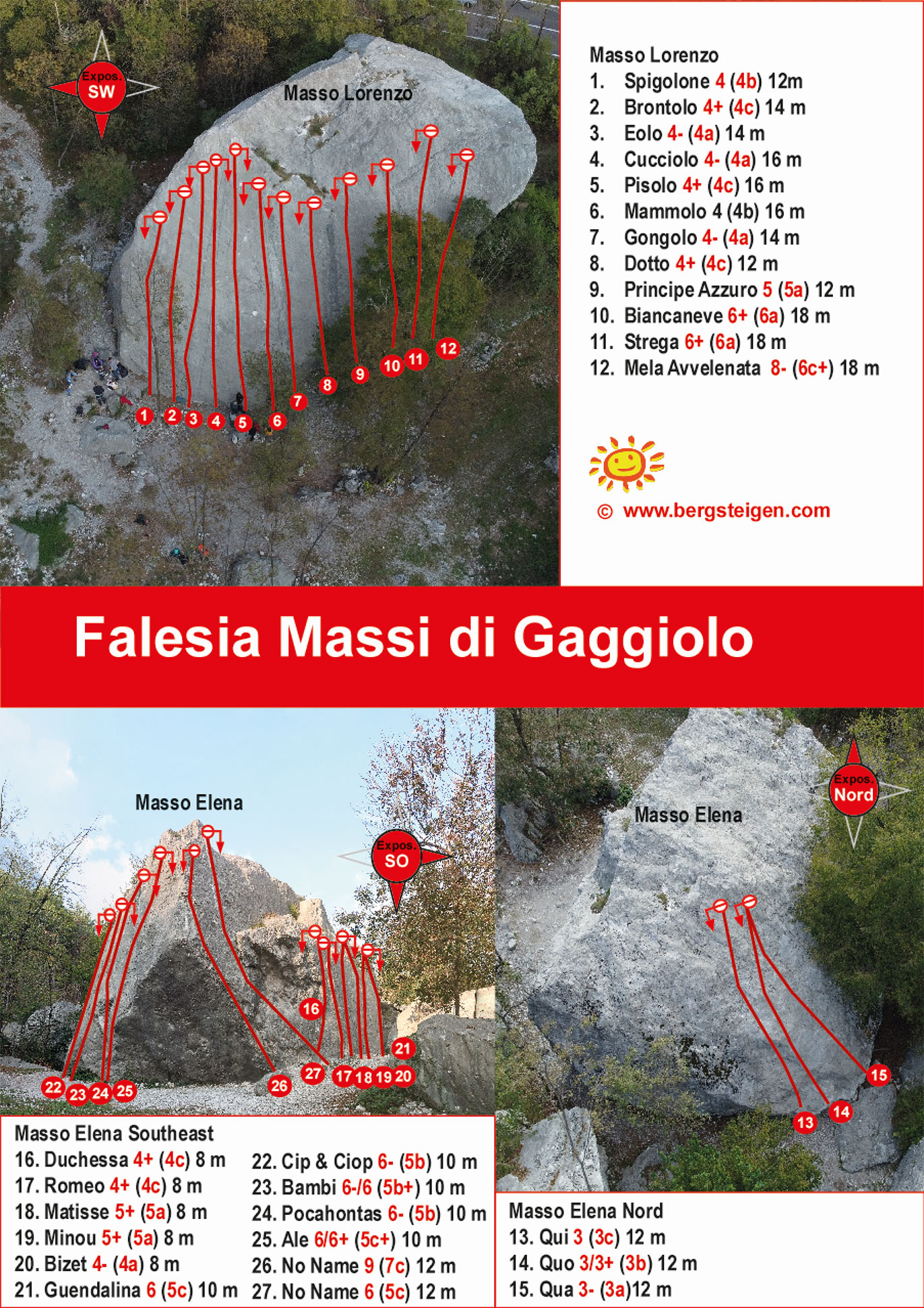 Massi ist der Felsblock und genau der erwartete den Liebhaber sehr einfacher Kletterrouten am Falesia Massi di Gaggiolo am Fuß des Monte Brento. Es sind zwei große Felsblöcke auf einer ebenen Fläche an denen an fast 30 kurze, aber sehr gut abgesicherte und einfache Route bis auf die Blockspitze ziehen. Familien mit Kletter-Kindern oder Einsteiger in den Klettersport sind in der Regel dort anzutreffen - der Zustieg ist sehr kurz, die eher glatten, plattigen Routen extrem gut abgesichert, was will man noch mehr.