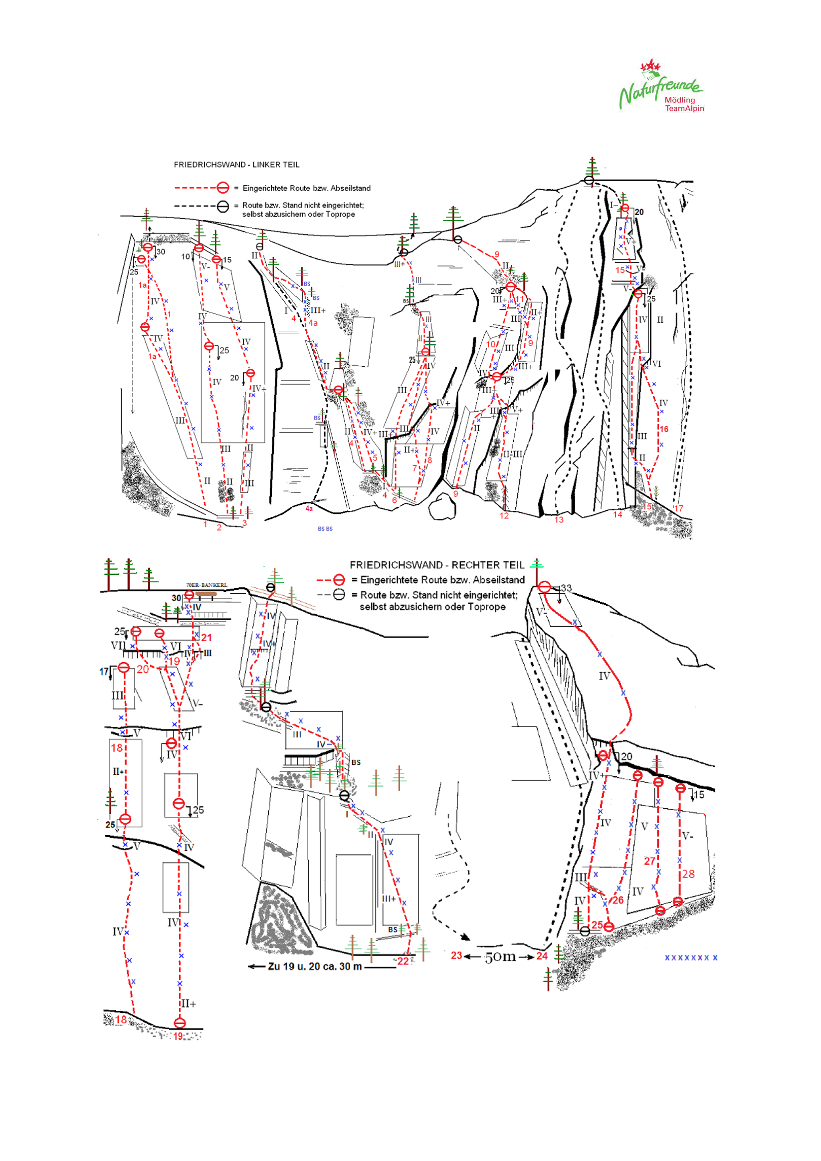ACHTUNG! Die Friedrichswand ist als alpines Klettergebiet einzustufen. Mit objektiven Gefahren wie Steinschlag, brüchigem Fels und beeinträchtigter Haltbarkeit der Sicherungspunkte im Gestein ist zu rechnen! Routencharakter: Hauptsächlich stark geneigte Plattenkletterei, unterbrochen durch senkrechte bis stark überhängende, in den schweren Routen dachähnliche Plattenkanten. Öfters splittrig und brüchig; manchmal auch feste Platten. In den Routen wurden, besonders in den brüchigen Bereichen, speziell dafür gefertigte Klebehaken gesetzt. Jedoch sind diese nicht vor einem Ausbröckeln des umgebenden Gesteins sicher! Der Wandfuß ist besonders bei Regen und Unwettern UNBEDINGT zu meiden! Die Absicherung und die Beschreibung der Routen erfolgte nach besten Wissen und Gewissen; trotzdem kann keinerlei Haftung übernommen werden, da jeder Kletterer die Verantwortung für Routenauswahl und das Einschätzen der persönlichen Leistungsfähigkeit selbst übernehmen muß!