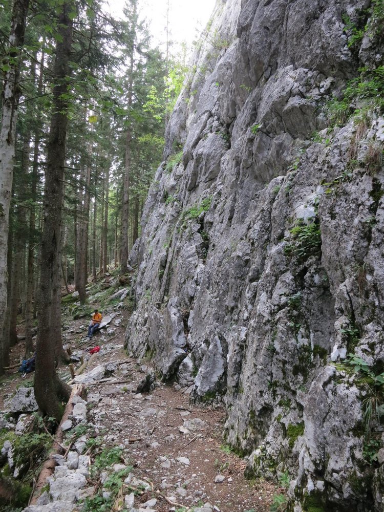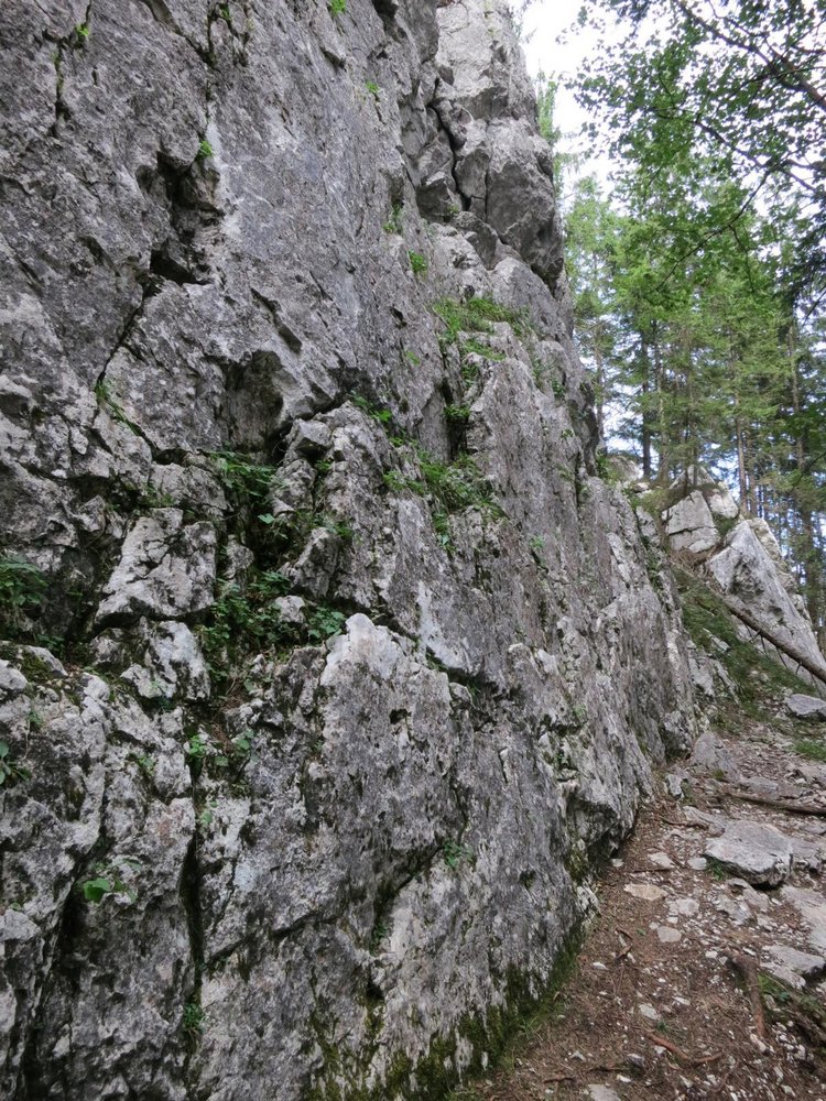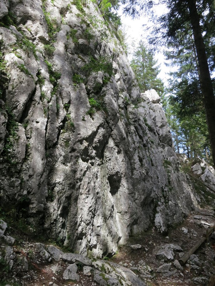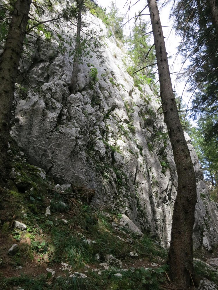 Von den Parkplätzen beim Lesehotel dem Wegweiser zur Rossmoosalm folgen und auf dem Schotterweg bis ans obere Ende der großen Almwiese. Hier auf auf der Forststraße 200m horizontal nach rechts (an der obersten Almhütte vorbei, eine Straßenabzweigung nach rechts unten ignorieren) bis zum rechten Wiesenrand. Wo der Wald beginnt, links abzweigen und auf schwachen Trittspuren im Wald Richtung Nordwesten zur Wand. Mit dem MTB kann man in 15 Min. fast bis zur Wand fahren.