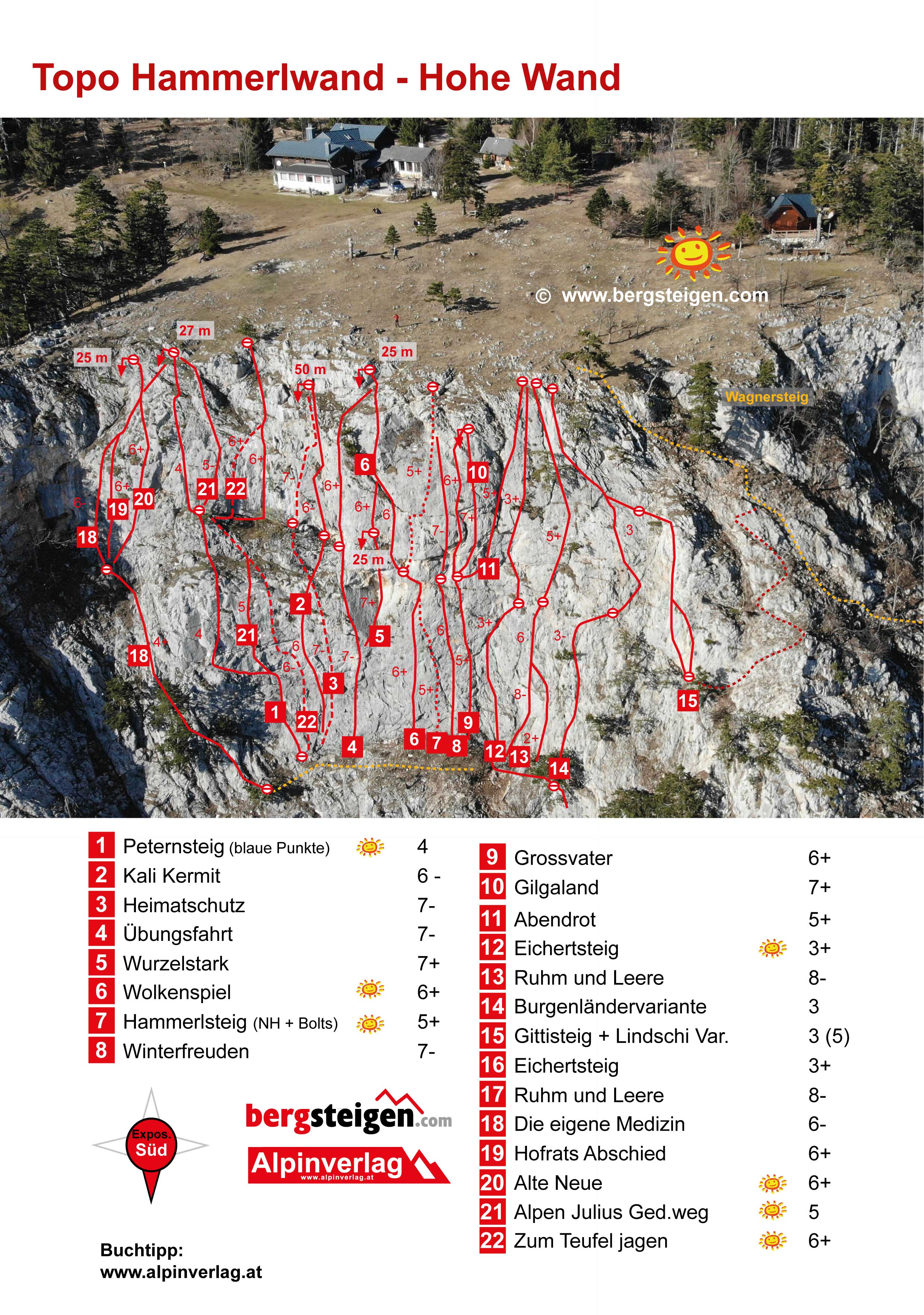Die Hammerlwand ist ein ideales Winterklettergebiet bei der Eicherthütte, das durch Abseilen (50 m bzw. 2 x 25 m) von oben erreicht wird. Die Routen sind durchwegs lohnend, der Fels ist sehr gut.