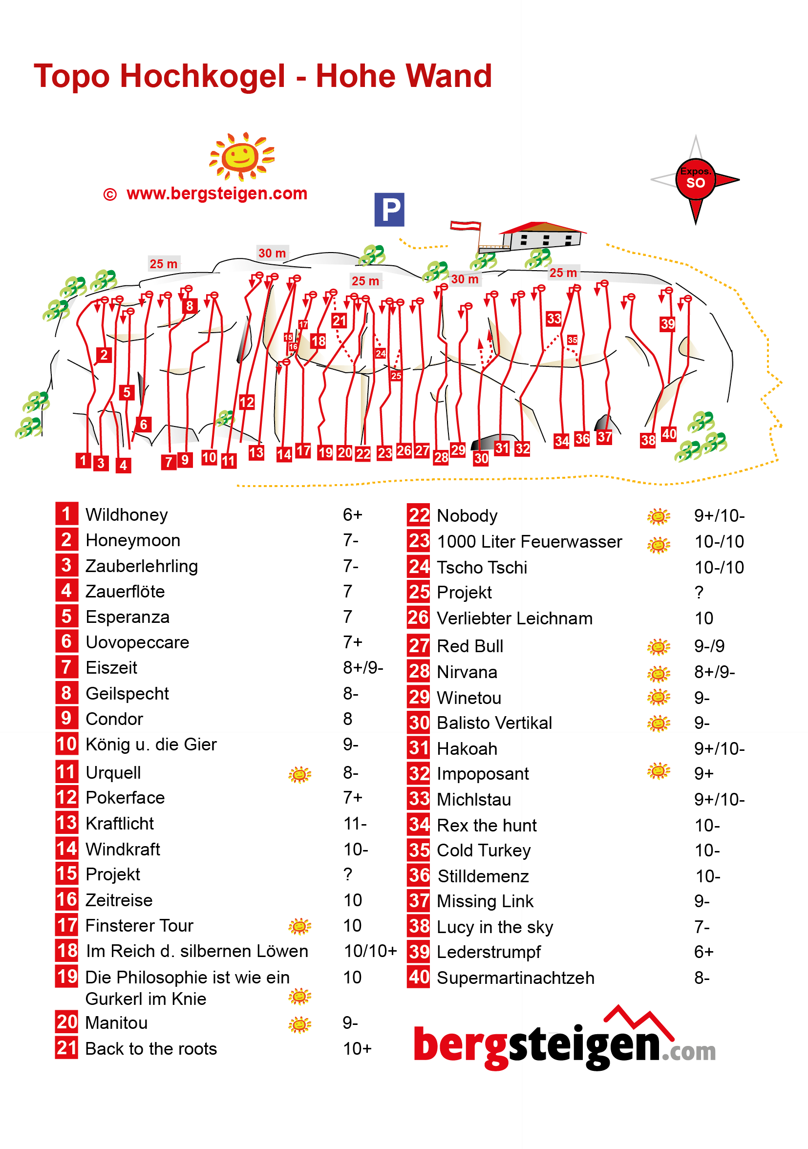 Von der A2 bis zur Ausfahrt Wiener Neustadt West, ab hier beschildert bis nach Stollhof. Nun die Hohe Wand Straße hinauf, nach den Serpentinen nach links und weiter bis zum Hochkogelhaus (ist beschildert). Hier parken und in ca. 4 min. zum Wandfuß (siehe Topo).