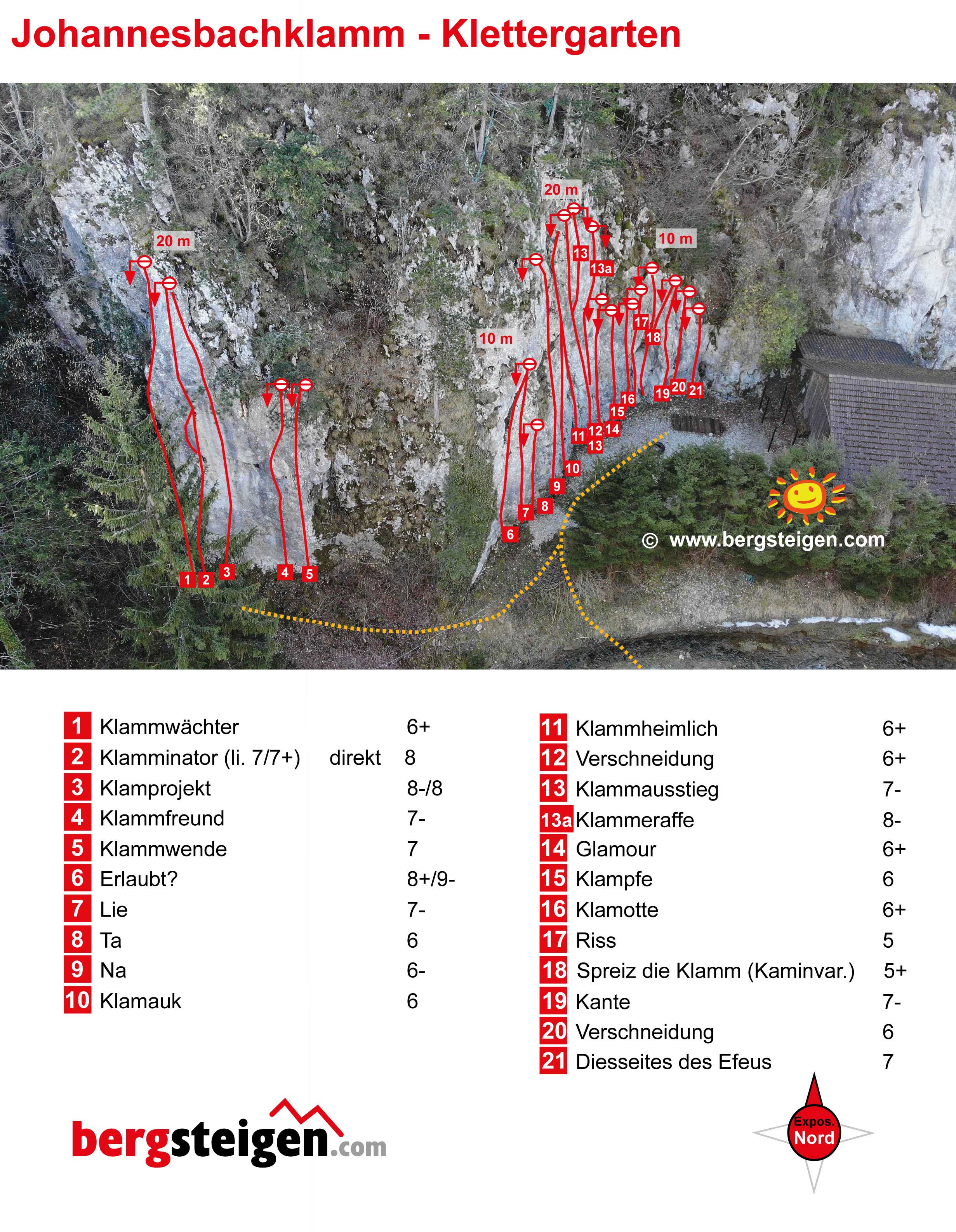 Das Klettern wird im Bereich des gewachsenen Klettergartens "Johannesbachklamm" vom Eigentümer geduldet. Der Klettergarten wird nicht gewartet. Das Klettern erfolgt auf eigene Gefahr, es wird keine Haftung übernommen. Das Tragen eines Helmes wird dringend empfohlen.