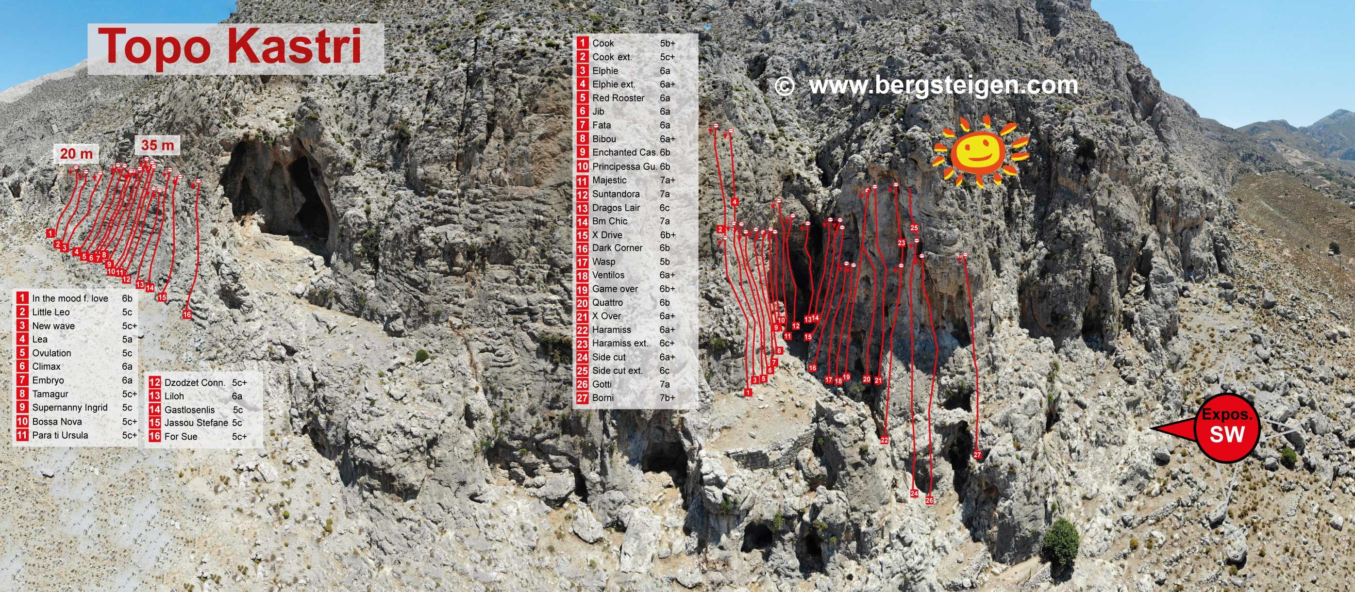 Der Felszug oberhalb Emborios, bestehend aus Kreissal, der Kastri-Burg. Ein guter Kletterspot für den Winter. Die Ruinen der antiken Burg Kastri bieten eine nette Kulisse. Die Routennamen sind hier nur vereinzelt an den Einstiegen zu finden. Hinsichtilich Kletterei dominiert scharfe, fester Kalk mit guten Griffen.
