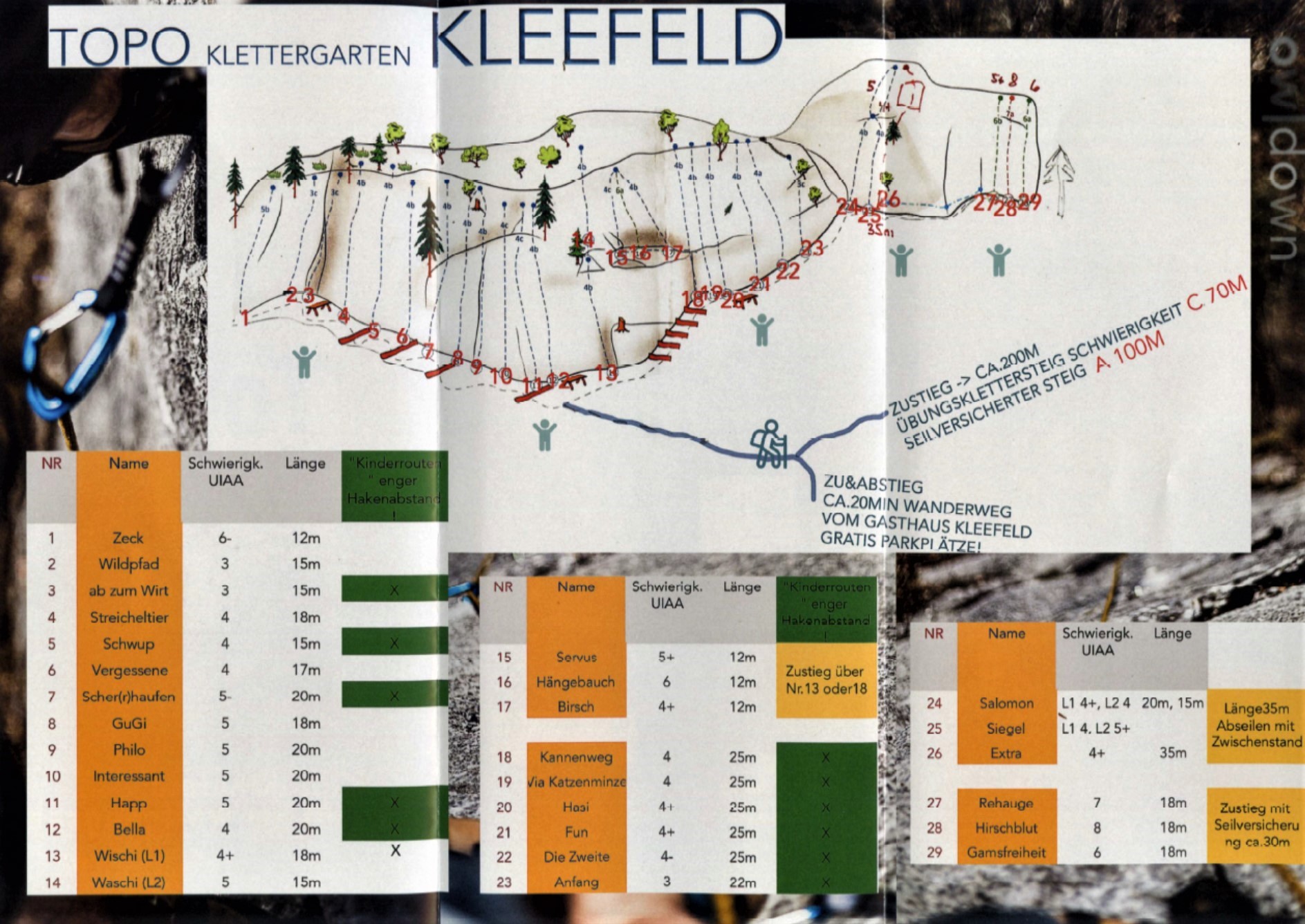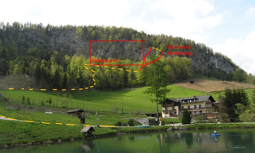 Schöner, insbesondere für Anfänger geeigneter Klettergarten mit gut abgesicherteren leichten Routen. Absolutes Familien-, Anfänger-, Wiedereinsteiger- und Kursklettergebiet. Gleich neben dem Klettergarten gibt es einen neuen Übungsklettersteig, Schwierigkeit C ca. 60 m, einen versicherten Steig, Schwierigkeit A ca. 100 m und einen Rundwanderweg mit herrlichen Aussichtspunkten. Für „Nichtkletterer“ gibt es beim Gasthaus einen Wildpark, Gastgarten, Kinderspielplatz . . .
