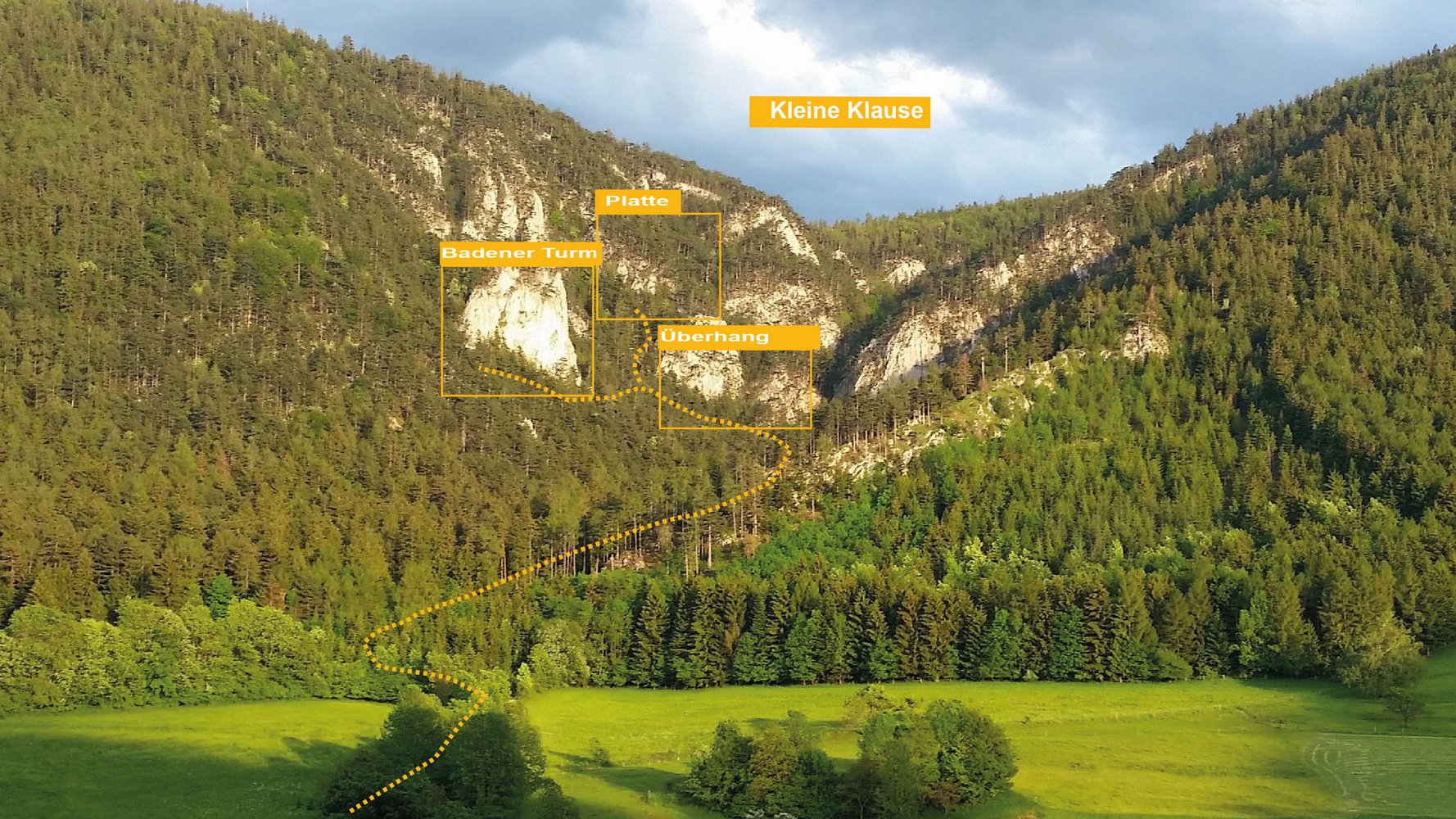 Vom Parkplatz dem markierten Wanderweg richtung Hohe Wand, Kleine Klause bis zu den Felsen folgen, dann nach links zu den Sektoren.