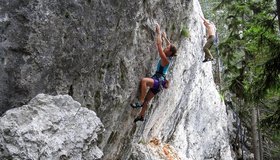 Toller Klettergarten mit drei Sektoren - Badener Turm, Platte und Überhang. Am Badener Turm dominiern lange, steile und auch nicht immer ganz feste Routen, auf der Platte Genusskletterei bis 7+/8- und am ersten Sektor, dem Überhang steile Wandkletterei. Die Sektoren sind ab ca. 14 Uhr in der Sonne, wobei bei Platte und Überhang Bäume am Einstieg Schatten geben.