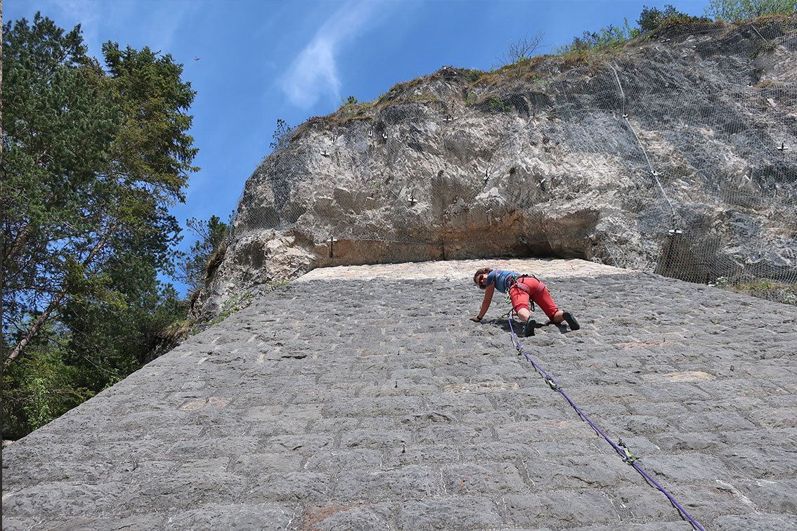 Achtung: Der Klettergarten liegt direkt an einem sehr stark frequentierten Radweg – um Unfälle zu vermeiden, sollte man nicht zu weit in der Straße stehen bzw. auch das Seil eher nahe an der Wand auf den Boden legen.